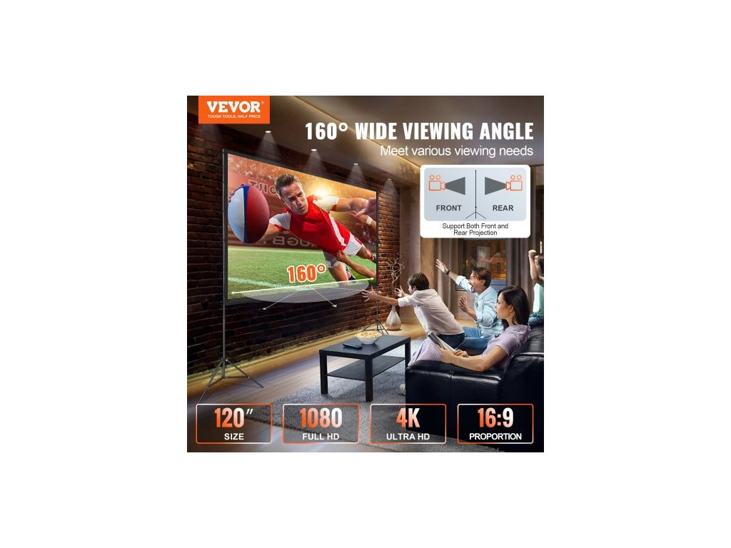 Projekční plátno se stojanem, 120 palců 16:9 4K 1080 HD venkovní filmové plátno se stojanem, projekční plátno bez vrásek se stativmi a přepravní taškou, pro domácí kino, filmový večer na zahradě