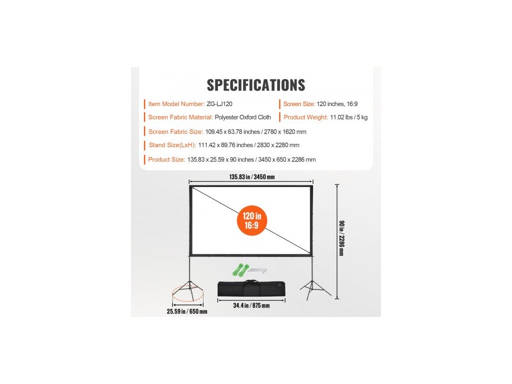 Velikost plátna: 120 palců, 16:9,Číslo modelu položky: ZG-LJ120,Hmotnost výrobku: 11,02 lbs / 5 kg,Rozměry látky plátna: 109,45 x 63,78 palců / 2780 x 1620 mm,Rozměry stojanu (DxV): 111,42 x 89,76 palců / 2830 x 2280 mm,Materiál látky plátna: Polyesterová oxfordská tkanina,Rozměry výrobku: 135,83 x 25,59 x 90 palců / 3450 x 650 x 2286 mm