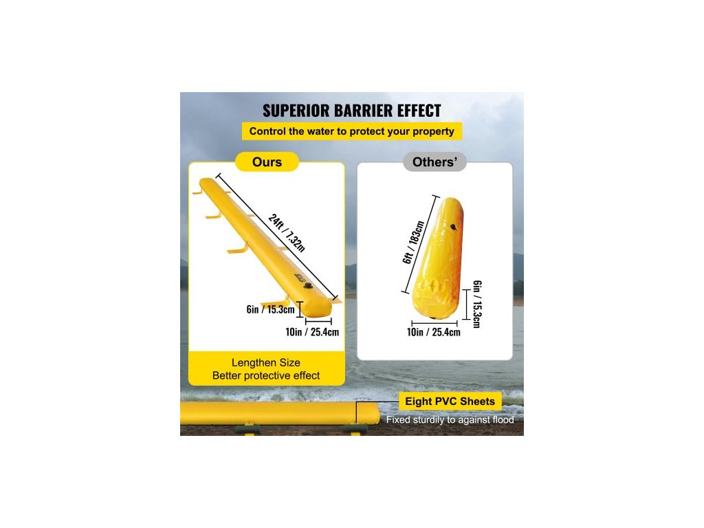 Objem vody: 76,6 gal / 290 l,Rozměry produktu (D x Š x V): 24 ft x 10 in x 6 in / 7,32 m x 25,4 cm x 15,3 cm,Model: Protipovodňová zábrana 24 ft x 10 in,Hmotnost (naplněná): 662 lbs / 300 kg,Materiál: Průmyslové PVC,Čistá hmotnost: 15,4 lbs / 7 kg