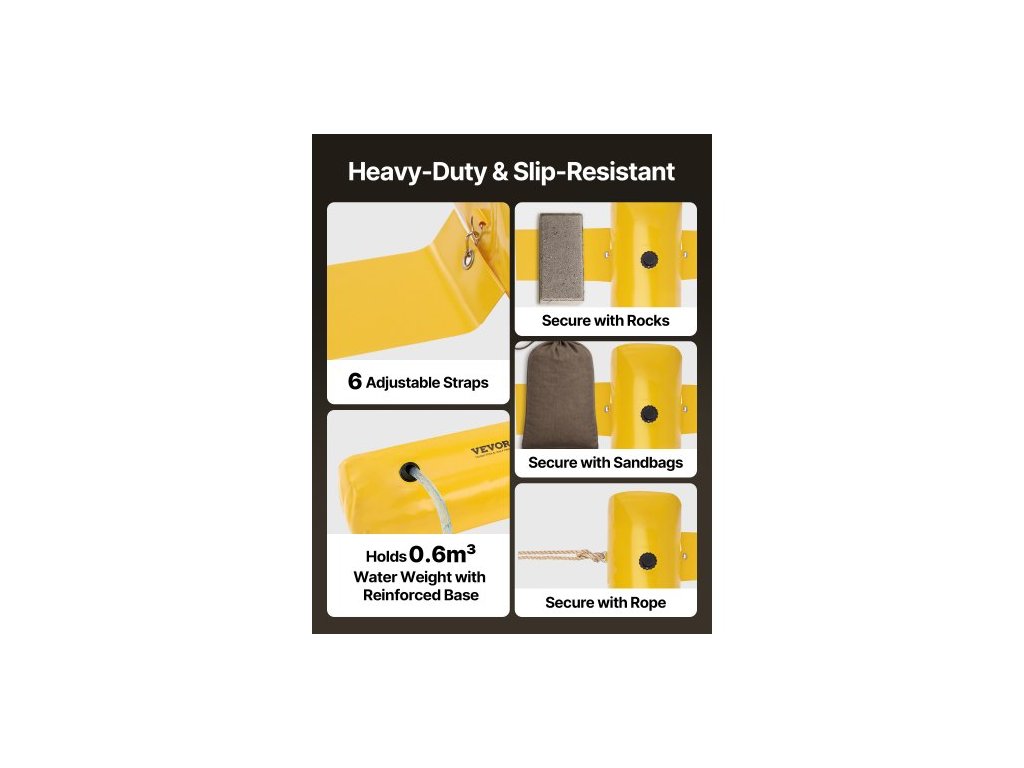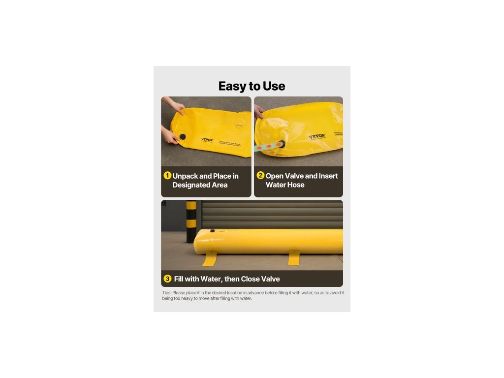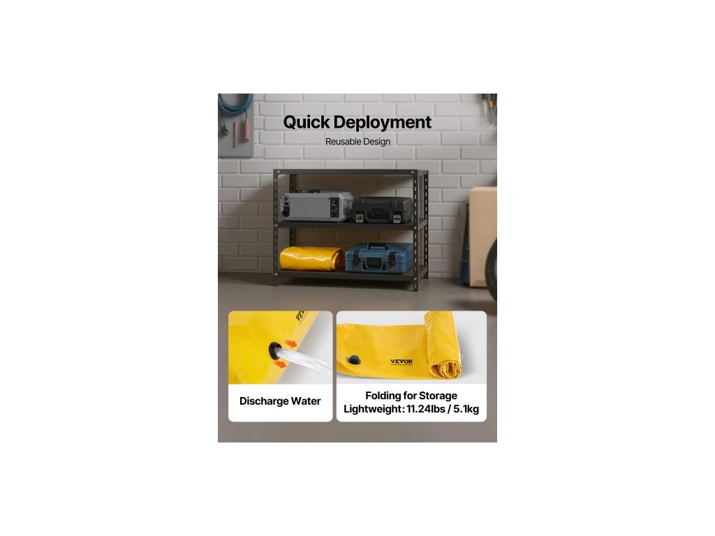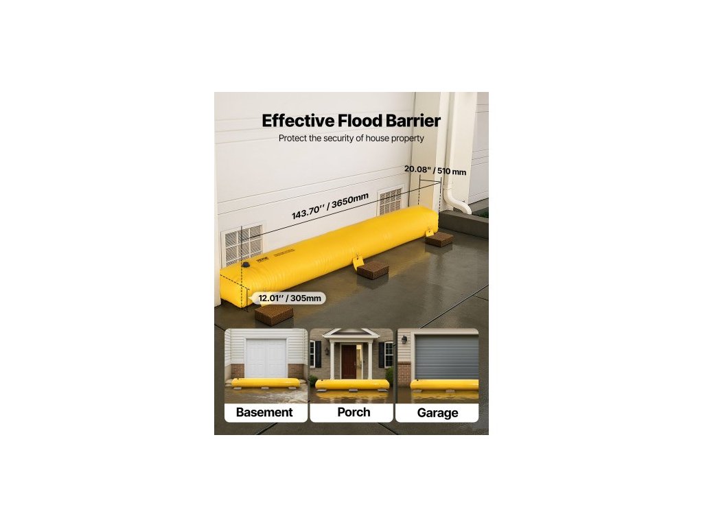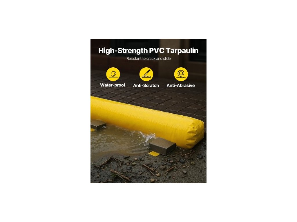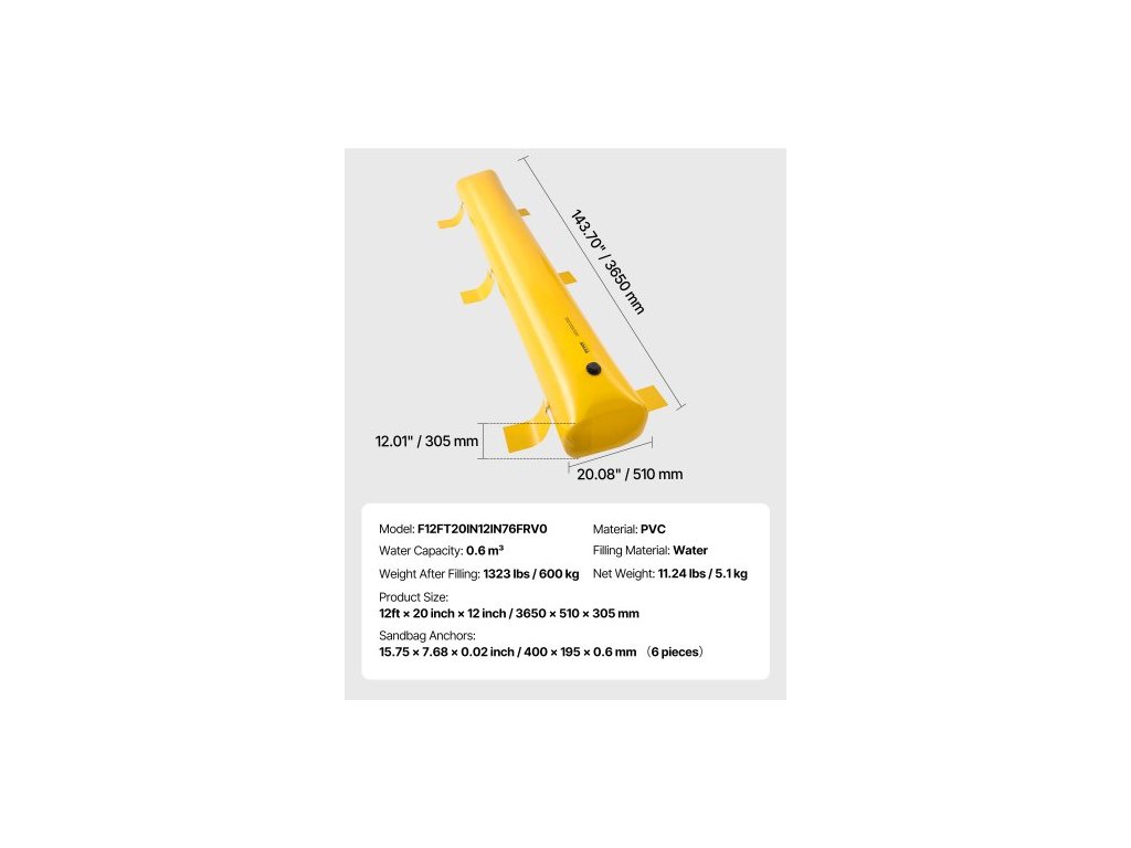 Objem vody: 132 gal / 500 l,Rozměry produktu (D x Š x V): 12 ft x 20 in x 12 in / 3,66 m x 51 cm x 30,5 cm,Model: Protipovodňová zábrana 12 ft x 20 in,Hmotnost (naplněná): 1113 lbs / 505 kg,Materiál: Průmyslové PVC,Čistá hmotnost: 11 lbs / 5 kg