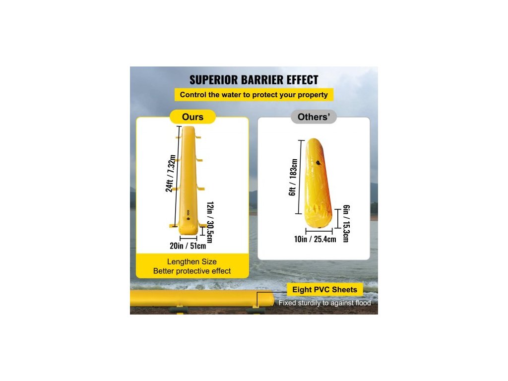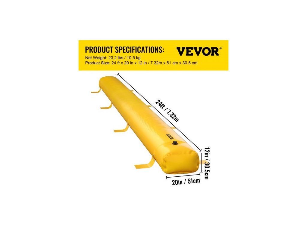 Objem vody: 288,7 gal / 1093 l,Rozměry produktu (D x Š x V): 24 ft x 20 in x 12 in / 7,32 m x 51 cm x 30,5 cm,Model: Protipovodňová bariéra 24 ft x 20 in,Hmotnost (naplněná): 2425 lbs / 1100 kg,Materiál: Průmyslové PVC,Čistá hmotnost: 23,2 lbs / 10,5 kg