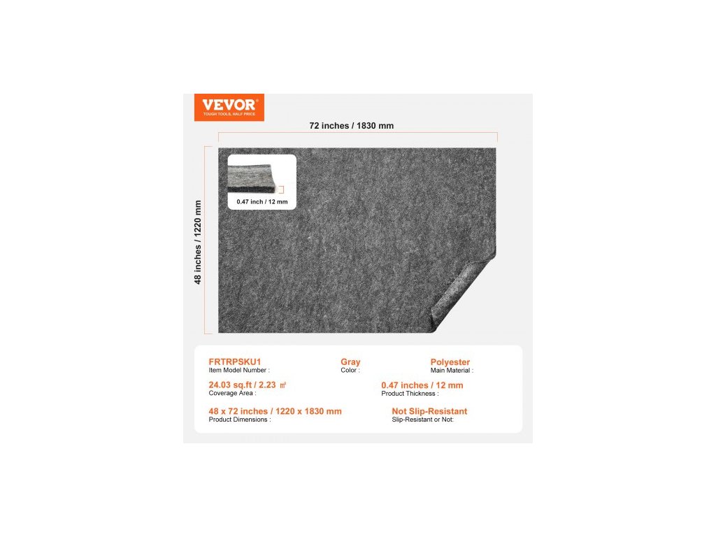 Čistá hmotnost (včetně veškerého příslušenství): 5,91 lbs / 2,68 kg ±3%,Barva: Šedá,Číslo modelu položky: FRTRPSKU1,Tloušťka výrobku: 0,47 palce / 12 mm (+1/-0 mm),Plocha pokrytí: 24,03 čtverečních stop / 2,23 ㎡,Rozměry výrobku: 48 x 72 palců / 1220 x 1830 mm,Hlavní materiál: Polyester