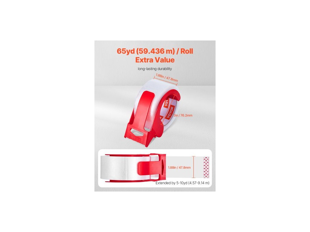 Tloušťka: 2,7 mil (0,068 mm),Rozměry produktu (jednotlivý): 6,1 x 2,17 x 4,21 palce / 155 x 55 x 107 mm,Délka: 65 yardů (59,436 m),Velikost jádra: ⌀3 palce (⌀76,2 mm),Číslo modelu položky: ID274865P12D2,Hmotnost produktu: 5,73 lbs / 2,6 kg,Rozměry balení produktu: 12,99 x 9,06 x 4,72 palce / 330 x 230 x 120 mm,Složení sady: 12 rolí pásky + 2 odvíječe,Šířka: 1,88 palce (47,8 mm)