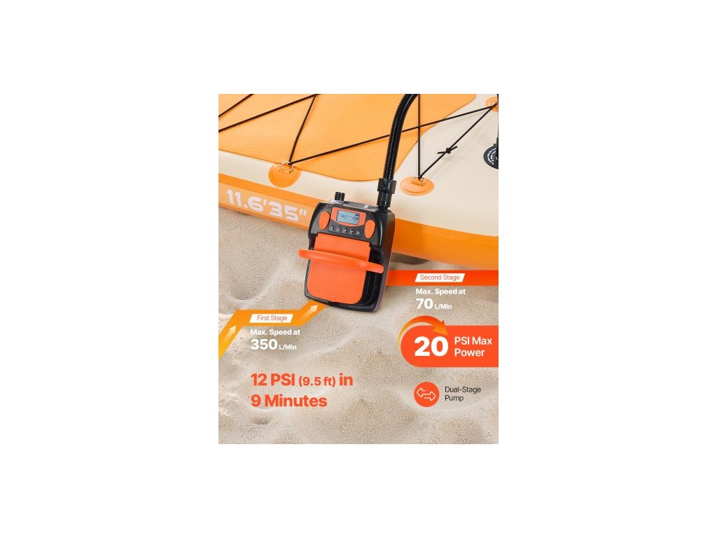 Pumpa na paddleboard 20PSI, dobíjecí baterie, dvoustupňové nafukování a vyfukování SUP s automatickým vypnutím, 12V DC konektorem do auta a LED světlem, ideální pro nafukovací čluny, stany a matrace