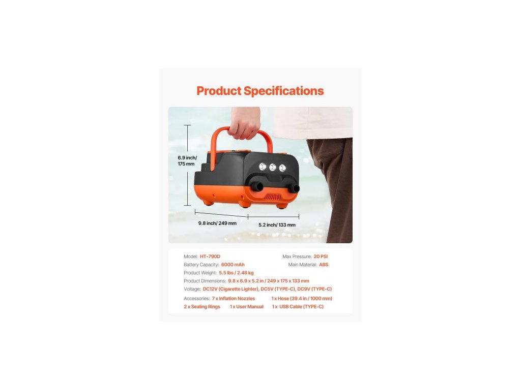 Kapacita baterie: 6000 mAh,Napětí: DC12V (zapalovač cigaret), DC5V (TYP-C), DC9V (TYP-C),Číslo modelu: HT-790D,Maximální tlak: 20 PSI,Hmotnost výrobku: 5,5 lbs / 2,48 kg,Rozměry výrobku: 9,8 x 6,9 x 5,2 palce / 249 x 175 x 133 mm,Hlavní materiál: ABS