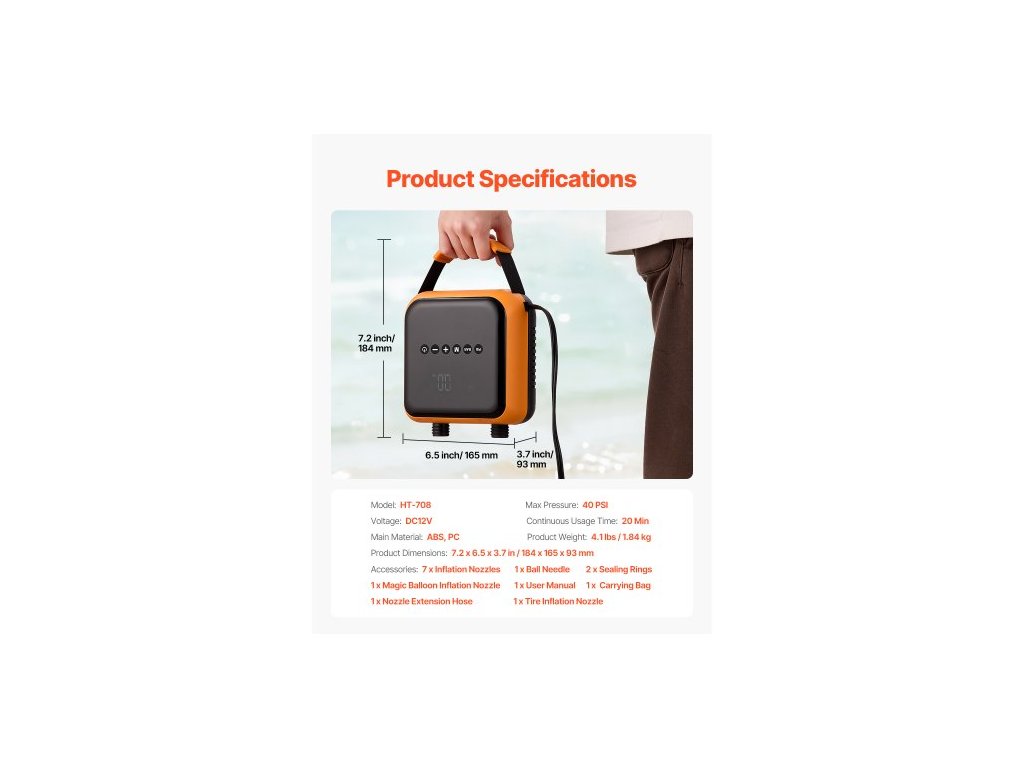 Doba nepřetržitého používání: 20 min, Napětí: DC12V, Číslo modelu položky: HT-708, Maximální tlak: 40 PSI, Hmotnost výrobku: 4,1 lbs / 1,84 kg, Rozměry výrobku: 7,2 x 6,5 x 3,7 palce / 184 x 165 x 93 mm, Hlavní materiál: ABS, PC