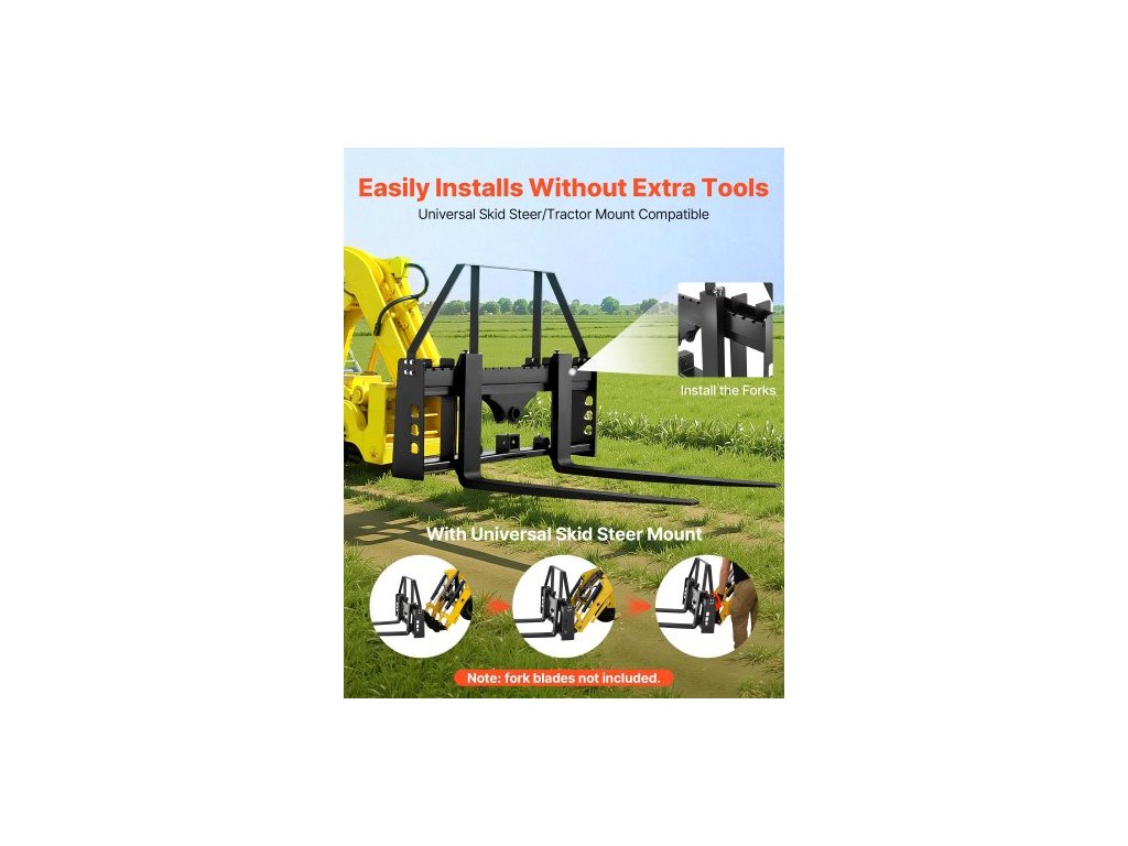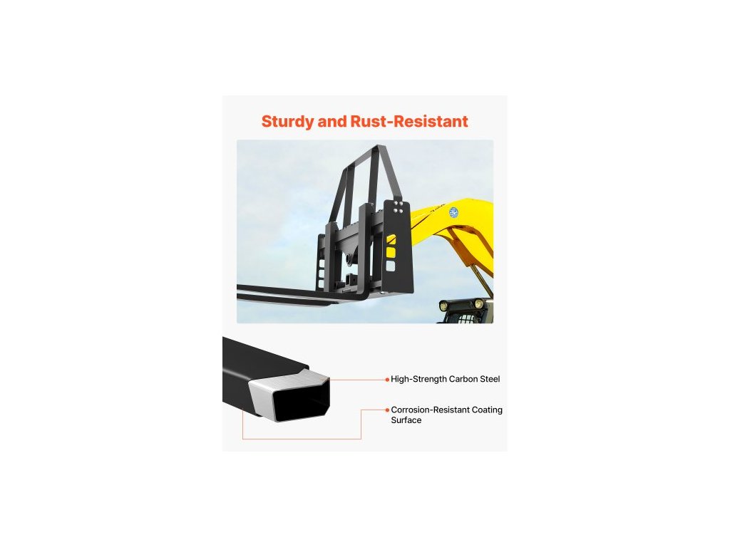 Rám paletových vidlí pro smykem řízené nakladače, jmenovitá nosnost 1814 kg, příslušenství rámu paletových vidlí 115 cm s 50,8mm závěsným uchycením a objímkami kopí, vhodné pro rychloupínací traktorové nakladače, pouze rámMontážní deska o tloušťce 0,5 palce