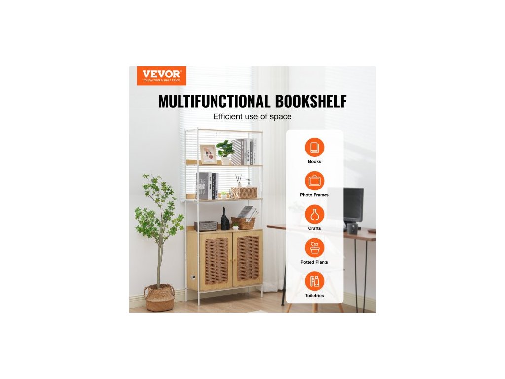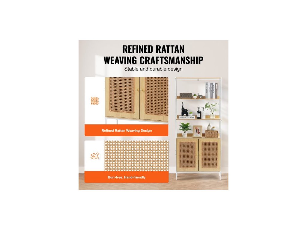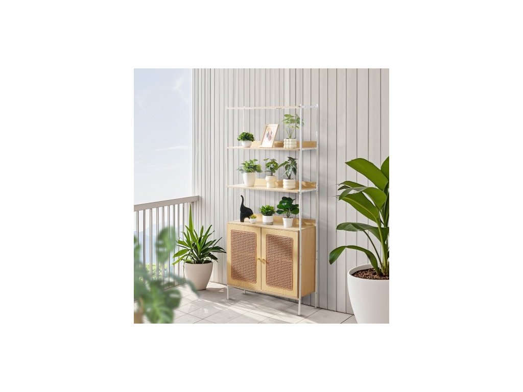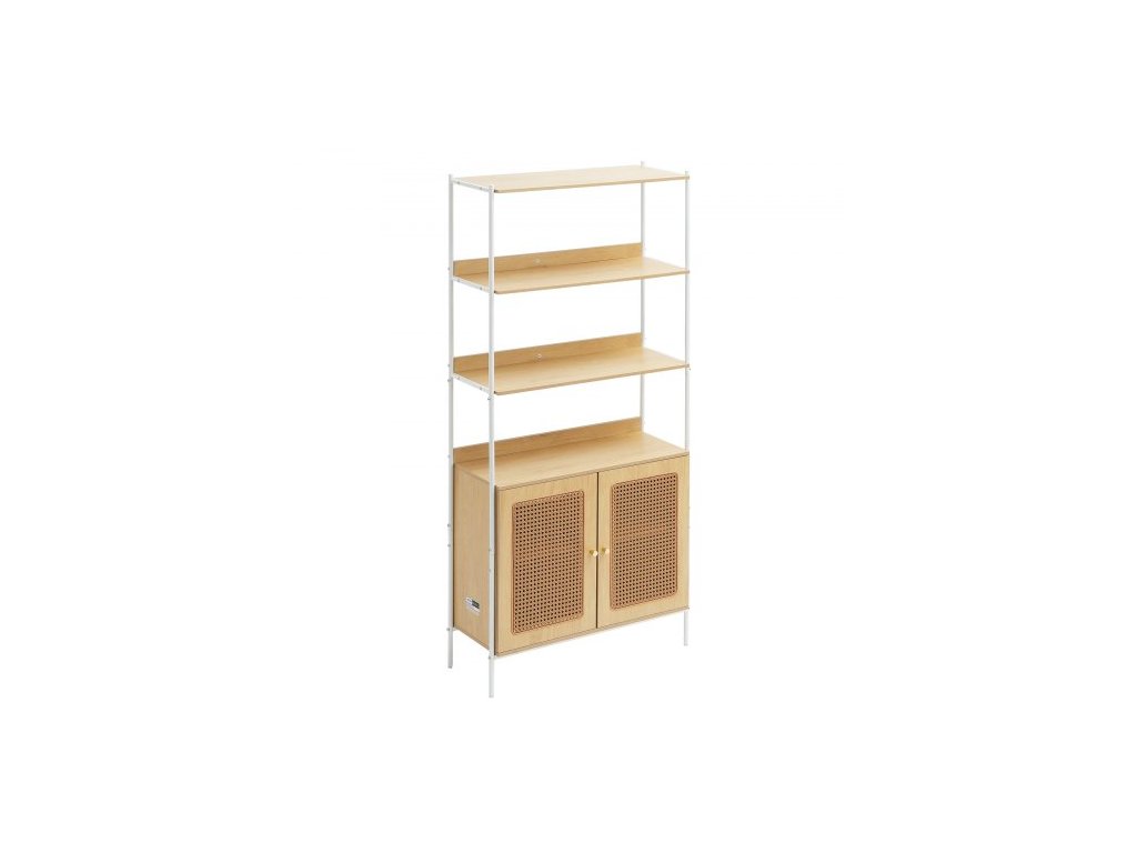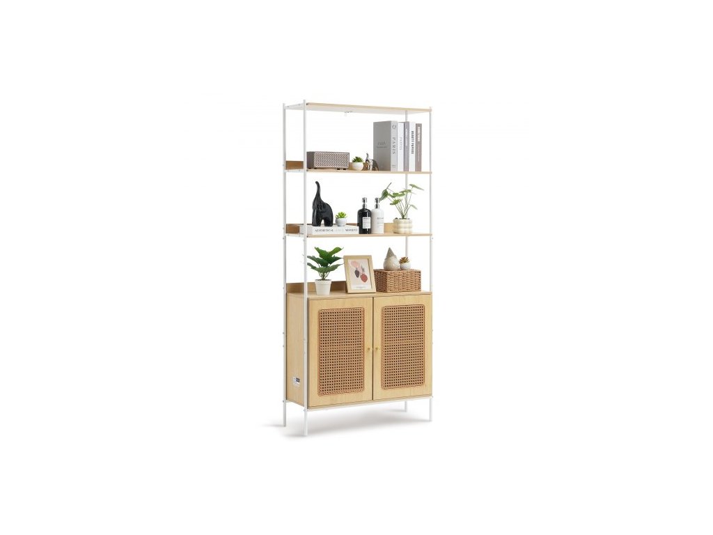 Knihovna z ratanu, žebříková police se 2 dvířky, obdélníkový volně stojící otevřený úložný regál, úložné police ideální do knihovny, zasedací místnosti, kanceláře, pracovny, přírodníÚložný systém 2 v 1