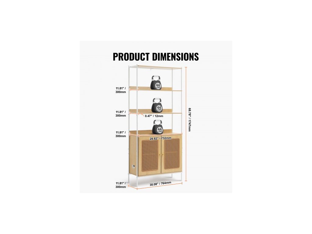 Rám: 0,63 x 0,03 palce / 16 x 0,7 mm,Nosnost: 44 liber na vrstvu,Nastavitelná výška police: 60 mm / 2,36 palce,Barva: Přírodní barva dřeva,Číslo modelu položky: HY-BTJ-008,Hmotnost výrobku: 46,30 liber / 21 kg,Materiál rámu: Ocelová trubka,Rozměry: 30,08 x 11,85 x 68,39 palce / 764 x 301 x 1737 mm,Ratan Materiál: Plastový ratan,Rozměry výrobku: 30,08 x 11,81 x 68,78 palce / 764 x 300 x 1747 mm,Vrstvy: 6vrstvá police + 2dveřová úložná skříňka,Materiál polic: MDF + melamin,Rozměry: 28,82 x 11,81 palce / 732 x 300 mm,Tloušťka: 0,47 palce / 12 mm,Nožičky: Nastavitelné nožičky s protiskluzovými podložkami