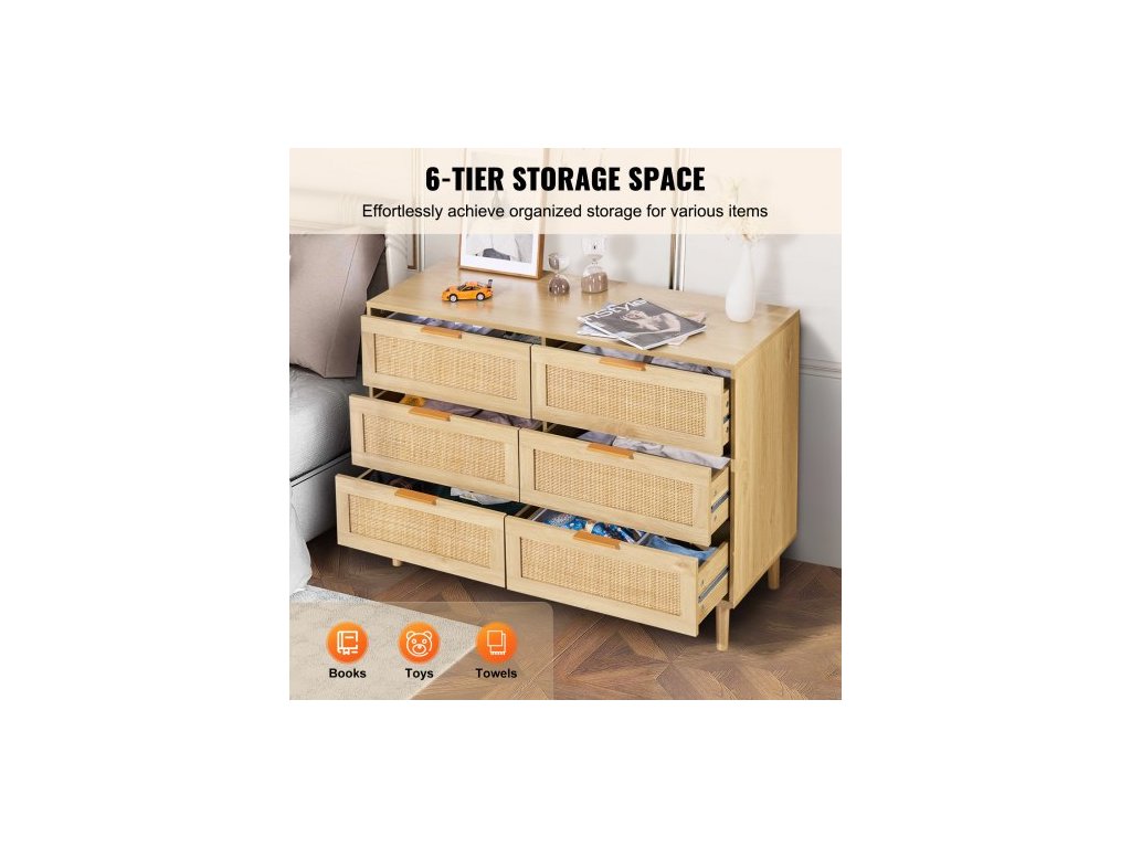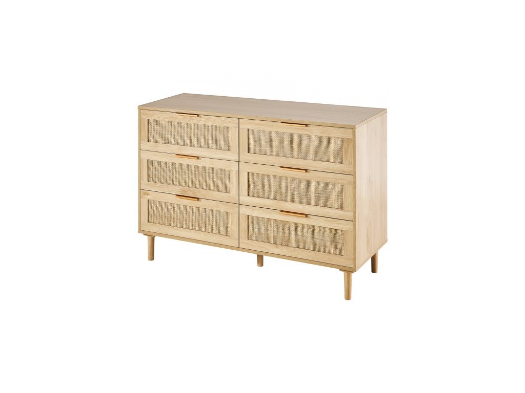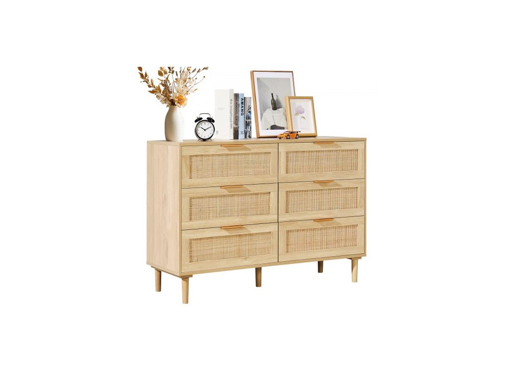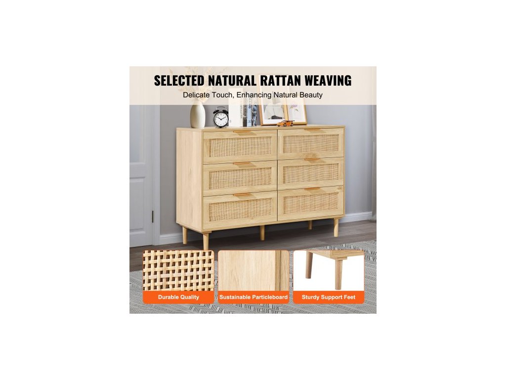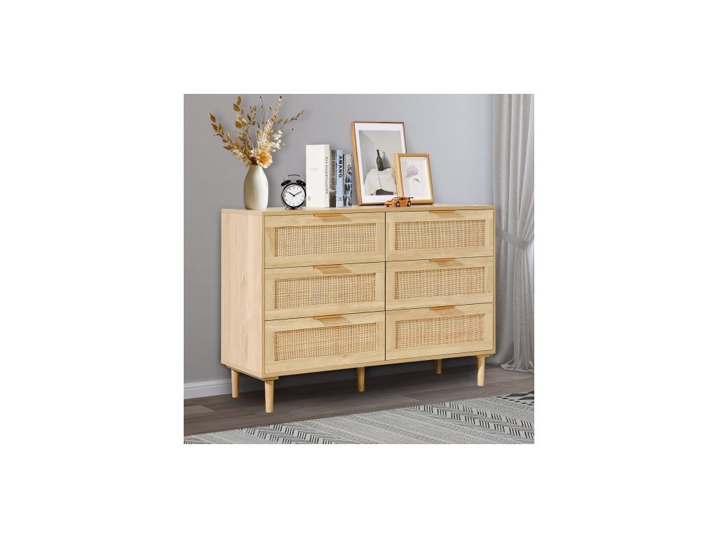 Ratanová komoda se 6 zásuvkami, Boho komoda, Ratanová komoda s prostorným úložným prostorem, Komoda z přírodního ratanu do ložnice, obývacího pokoje a chodby, Ratanový noční stolek s pevnými úchyty a nohami, HnědáDostatek úložného prostoru