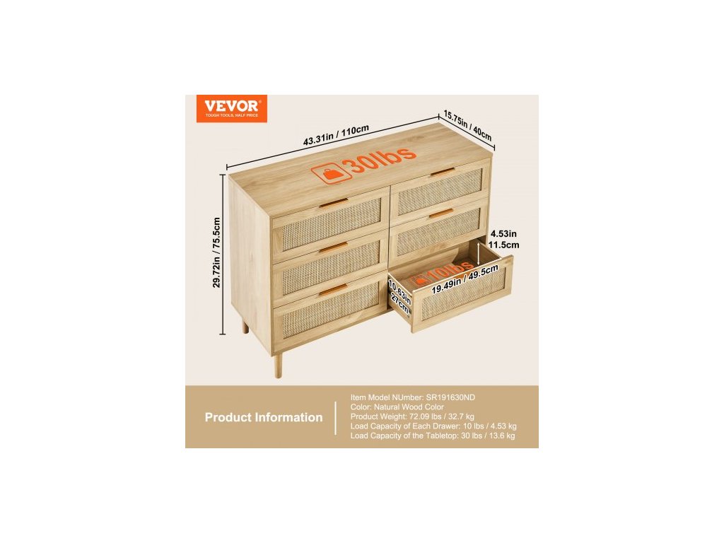 Rozměry zásuvky: 495 x 270 x 115 mm, Barva: Přírodní barva dřeva, Nosnost každé zásuvky: 4,53 kg, Hmotnost výrobku: 32,7 kg, Nosnost desky stolu: 13,6 kg, Číslo modelu výrobku: SR191630ND Rozměry: 43,31 x 15,75 x 29,72 palce / 1100 x 400 x 755 mm