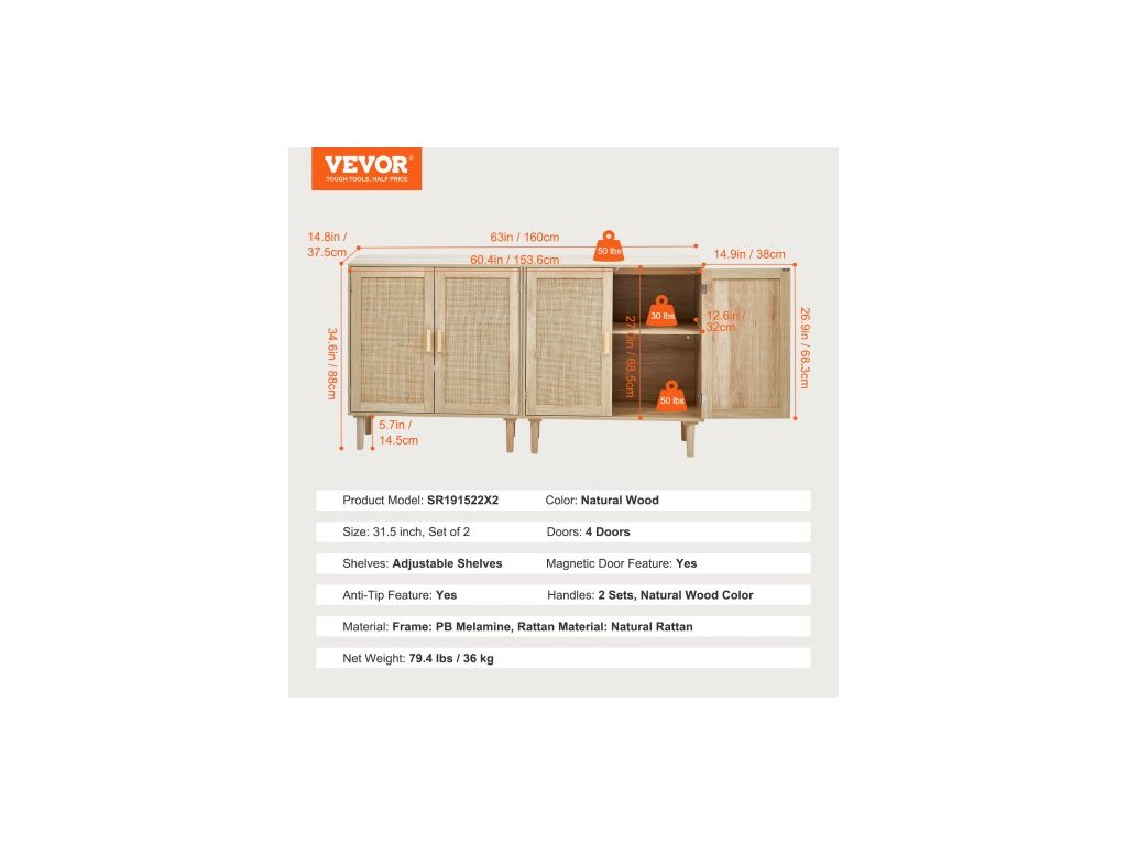 Rozměry podpěrných nohou: 5,9 x 1,4 palce / 150 x 35 mm,Ochrana proti převrácení: Ano,Velikost: 31,5 palce, Sada 2 kusů,Barva: Přírodní dřevo,Rozměry dvířek: 26,9 x 1,6 palce / 683 x 40 mm,Police: 30 lbs / 13,6 kg,Úchytky: 2 sady, Barva přírodního dřeva,Materiál: Rám: PB melamin, Ratan, Materiál: Přírodní ratan,Rozměry výrobku: 31,5 x 14,8 x 800 x 375 x 880 mm, Nosnost: Rozměry police: 617 x 356 mm, Spodní panel: 22,7 kg, Dveře: 4 dveře, Police: Nastavitelné police, Číslo modelu položky: SR191522X2, Horní panel: 22,7 kg, Magnetické dveře: Ano, Čistá hmotnost: 36 kg
