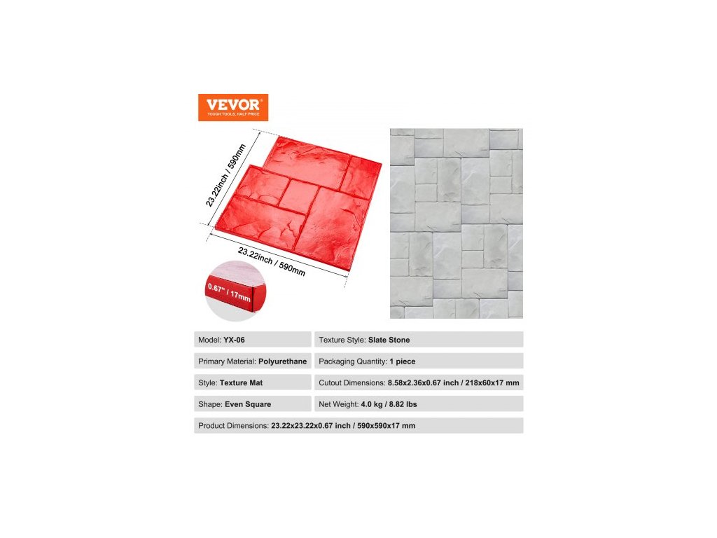 Hlavní materiál: Polyuretan,Rozměry výřezu: 8,58x2,36x0,67 palce / 218x60x17 mm,Tvar: Roven čtverec,Číslo modelu položky: YX-06,Styl textury: Břidlicový kámen,Styl: Texturovaná podložka,Množství v balení: 1 kus,Rozměry produktu: 23,22x23,22x0,67 palce / 590x590x17 mm,Čistá hmotnost: 4,0 kg / 8,82 lbs