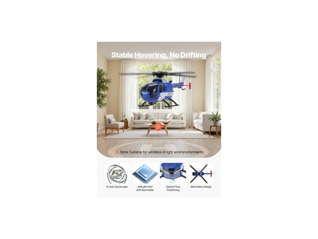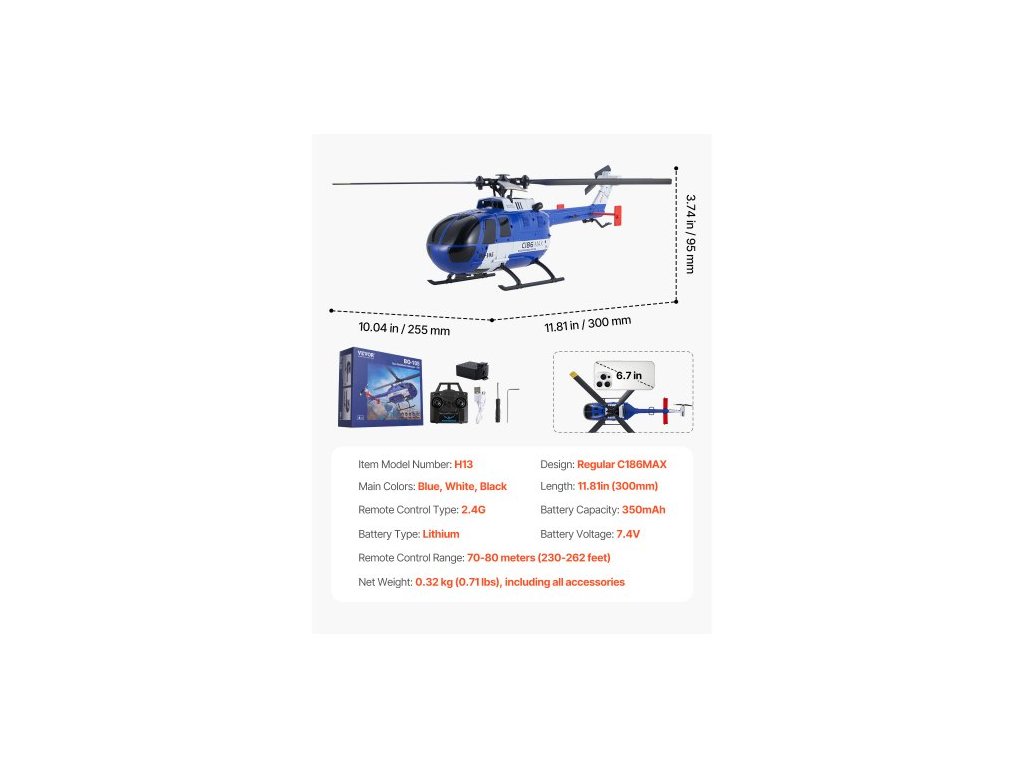 Napětí baterie: 7,4 V, Vhodné pro věk: 8+, 6osý gyroskop:,Doba nabíjení: cca. 75 minut (přes 5V, 1A), Design: Běžný C186MAX, Jmenovité kanály: 4, Velikost (s vrtulemi): 300 x 255 x 95 mm (11,81 x 10,04 x 3,74 palce), Počet baterií: 1, Nastavení směru letu: Ano, Osvětlení: Přední světlomet, Baterie: 4 x 1,5V AA (nejsou součástí balení), Číslo modelu: H13, Skutečný počet kanálů: 4, Typ dálkového ovládání: 2,4G, Dosah dálkového ovládání: 70-80 metrů (230-262 stop), Velikost (bez vrtulí): 240 x 65 x 95 mm (9,45 x 2,56 x 3,74 palce), Bezpečnostní prvky: Přední a zadní světla blikají společně, Udržování nadmořské výšky, Doba letu: Přibl. 15 minut, Bez křidélek, Funkce: Nahoru/dolů, vpřed/vzad, rotace vlevo/vpravo, boční let, kruhový let, let po trase, Hlavní barvy: Modrá, Bílá, Černá, Udržování výšky: Ano, Typ baterie: Lithiová, Kapacita baterie: 350 mAh, Materiál těla: ABS, Délka: 9,25 palce (235 mm), Čistá hmotnost: 0,32 kg (0,71 lbs), včetně veškerého příslušenství, Materiál vrtulí: ABS + 50 % PC