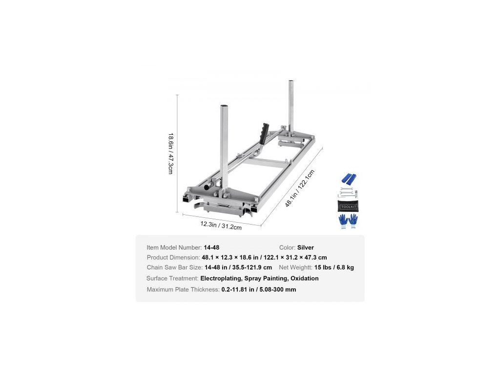 Rozměry lišty řetězové pily: 14-48 palců / 355-1219 mm,Rozměry výrobku: 48,1 x 12,3 x 18,6 palců / 1221 x 312 x 473 mm,Barva: stříbrná,Povrchová úprava: galvanické pokovování, stříkání, oxidace,Čistá hmotnost: 15 lbs / 6,8 kg,Maximální tloušťka řezu: 0,2-11,81 palců / 5,08-300 mm