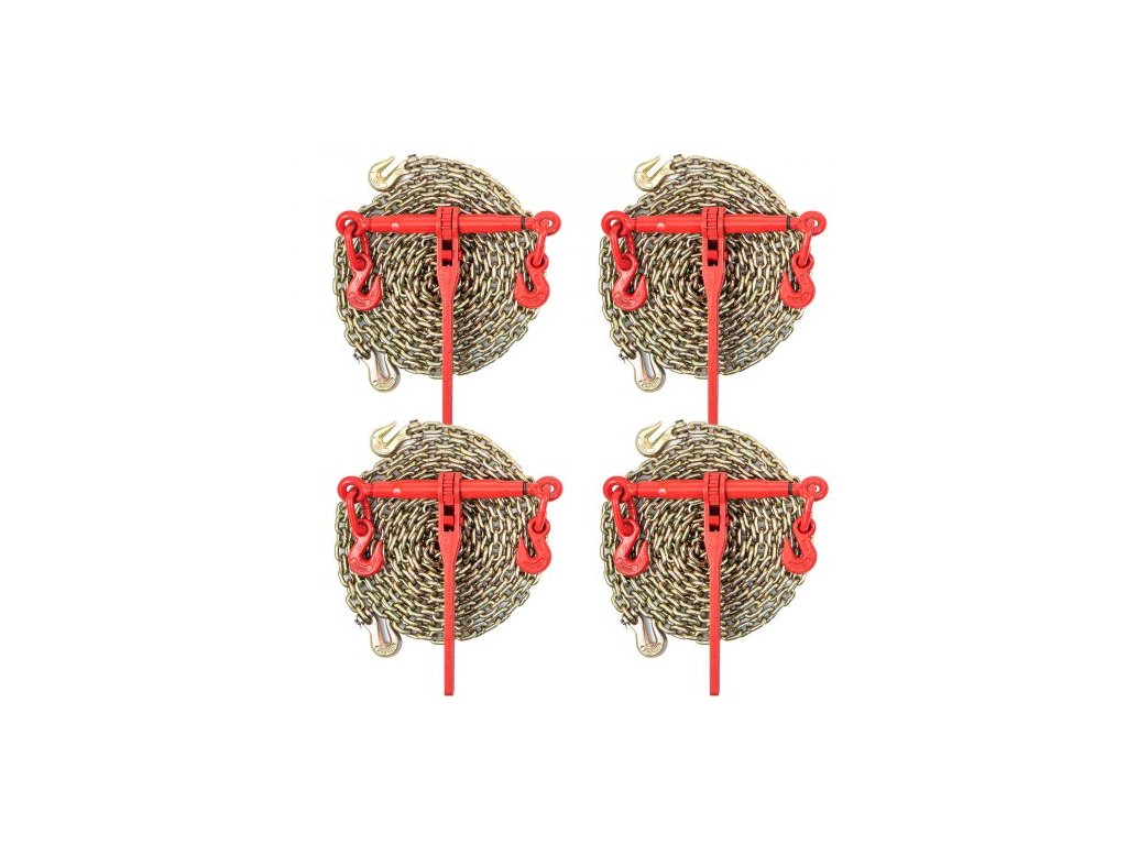 Řetězový vázací háček , sada pro upevnění 8 mm s nosností 2,45 tuny a dvěma uchopovacími háky, obsahuje (4) ráčnové vázací háčky - (4) řetězy třídy 80 o délce 6,4 m, přepravní sada pro tažení a odtahování