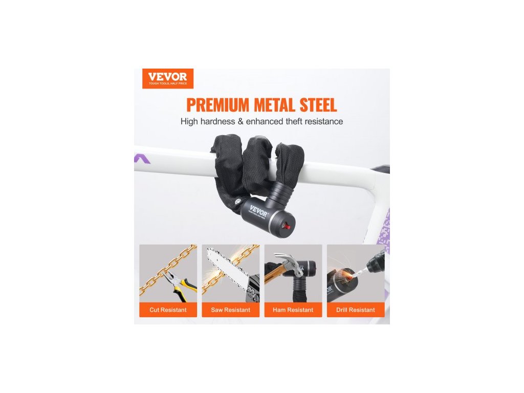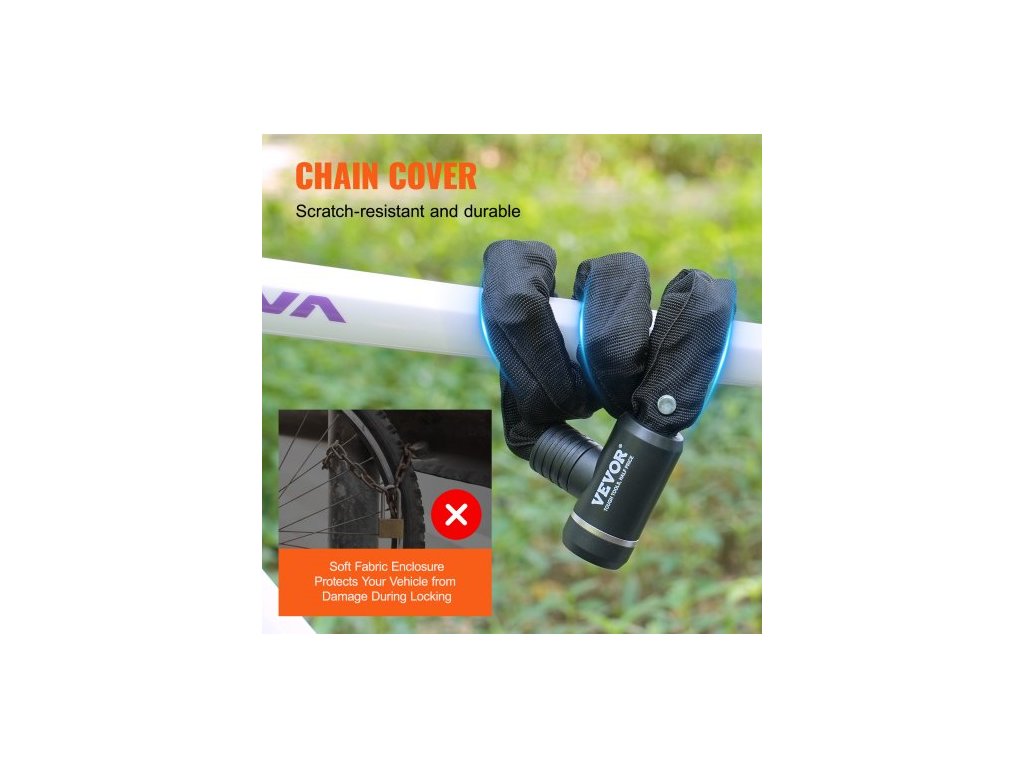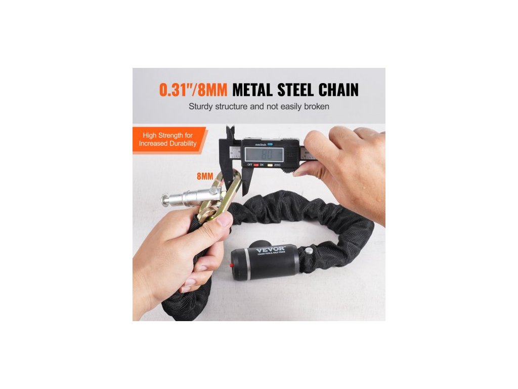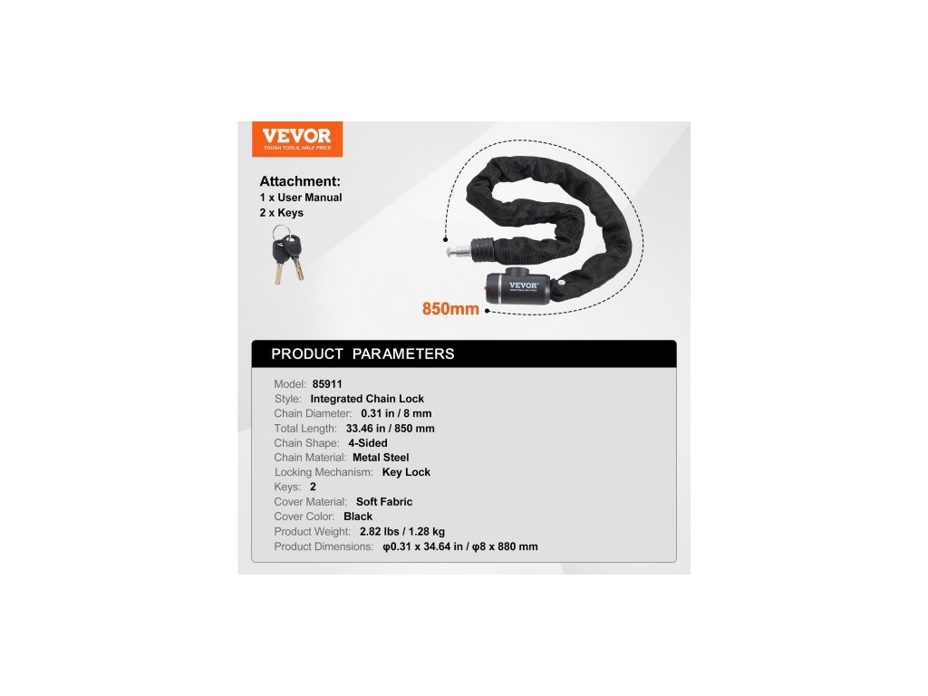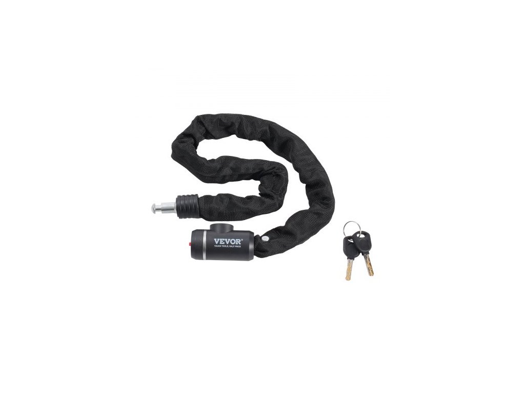 Celková délka: 34,64 palce / 880 mm,Barva krytu: Černá,Zamykací mechanismus: Zámek na klíč,Tvar řetězu: 4stranný,Klíče: 2,Model: 85911,Materiál krytu: Měkká tkanina,Hmotnost výrobku: 2,82 lbs / 1,28 kg,Styl: Integrovaný zámek na řetěz,Materiál řetězu: Kovová ocel,Rozměry výrobku: φ0,31 x 34,64 palce / φ8 x 880 mm,Průměr řetězu: 0,31 palce / 8 mm