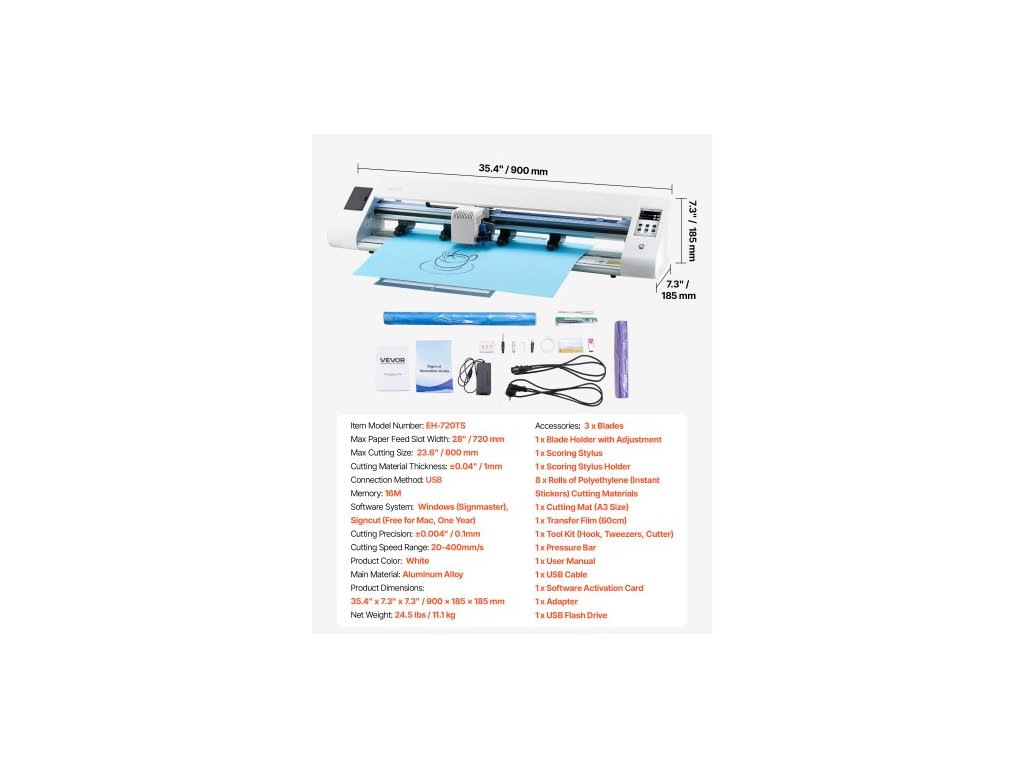 Čistá hmotnost (včetně veškerého příslušenství): 24,5 lbs / 11,1 kg,Maximální šířka otvoru pro podávání papíru: 28" / 720 mm,Paměť: 16M,Barva produktu: Bílá,Způsob připojení: USB,Tloušťka řezaného materiálu: ≤0,04" / 1 mm,Rozsah rychlosti řezání: 20-400 mm/s,Maximální velikost řezu: 23,6" / 600 mm,Softwarový systém: Windows (Signmaster), Signcut (zdarma pro Mac, jeden rok),Přesnost řezu: ±0,004" / 0,1 mm,Model položky Číslo: EH-720TS,Rozměry produktu (D x Š x V): 900 x 185 x 185 mm,Hlavní materiál: Hliníková slitina