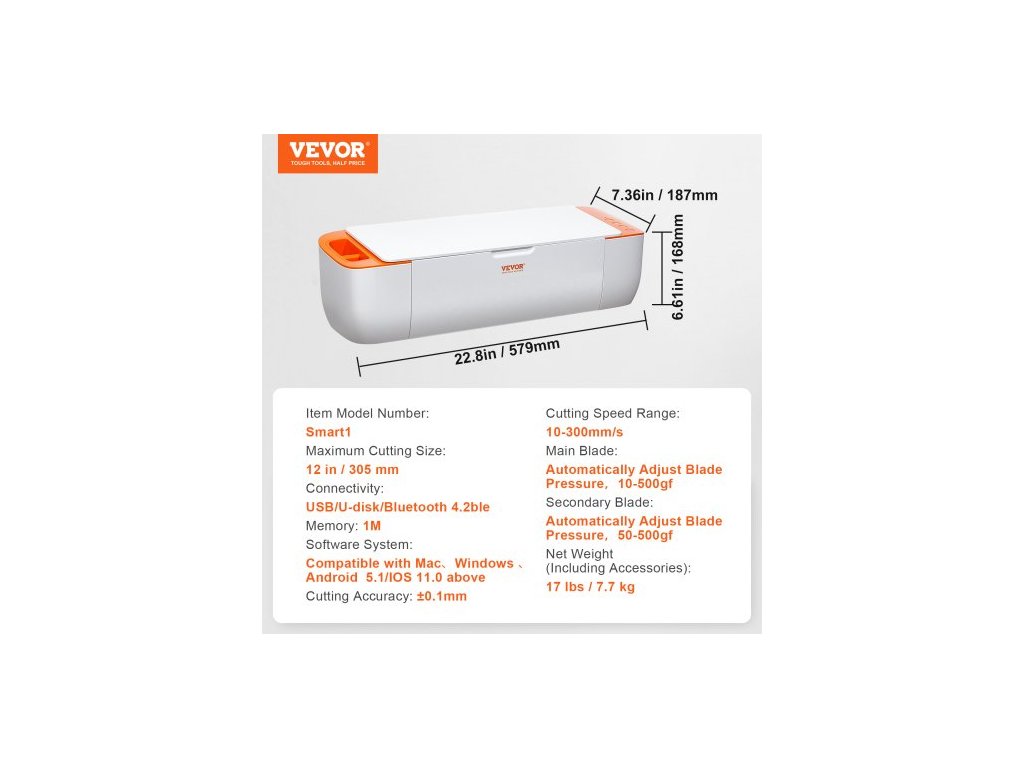 Maximální velikost řezu: 12 palců / 305 mm,Kompatibilní softwarový systém: Mac, Windows, Android 5.1/iOS 11.0 a vyšší,Rozsah rychlosti řezání: 10-300 mm/s,Přesnost řezu: ±0,1 mm,Rozměry produktu (DxŠxV): 22,8 × 7,36 × 6,61 palců / 579 × 187 × 168 mm,Paměť: 1 MB,Číslo modelu položky: Smart1,Připojení: USB/U-disk/Bluetooth 4.2ble,Hmotnost bez obalu příslušenství): 7,7 kg, Hlavní nůž: Automatické nastavení tlaku nůžek, 10–500 gf, Sekundární nůž: Automatické nastavení tlaku nůžek, 50–500 gf