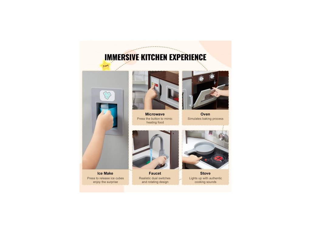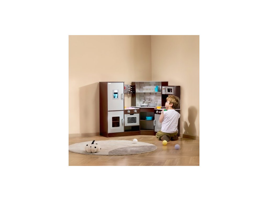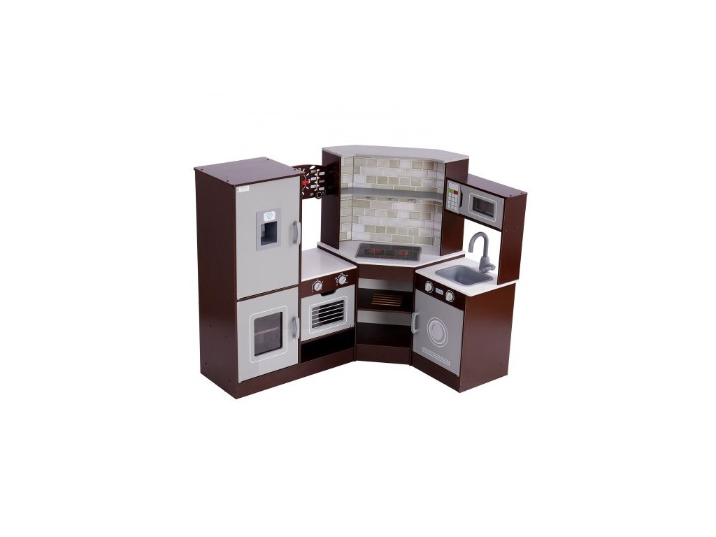 Rohová dřevěná kuchyňka, sada hraček se světly a zvuky, kuchyňka pro batolata s výrobníkem ledu, troubou, dřezem, hodinami, mikrovlnnou troubou, lednicí a příslušenstvím, pro batolata a předškoláky, hnědáRealistická kuchyňská sada