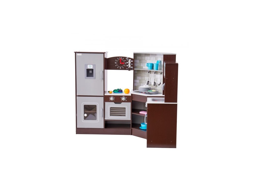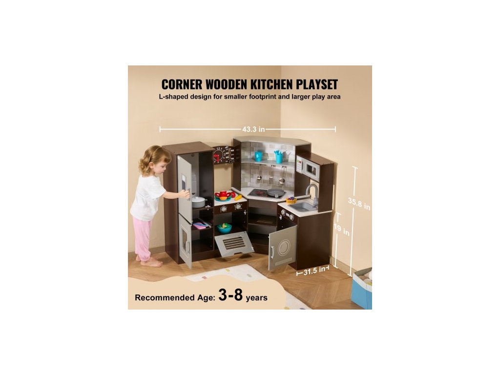 Barva: Hnědá, Číslo modelu položky: TLG81022, Hmotnost výrobku: 52 lbs/23,6 kg, Styl: Rohová kuchyňská sada, Realistické kuchyňské nádobí a jídlo: 24 dílů, Materiál: Dřevo (melaminová deska), Specifikace baterií: 2 x AAA baterie (nejsou součástí balení), Rozměry výrobku: 43,3 x 31,5 x 35,8 palce/110 x 80 x 91 cm