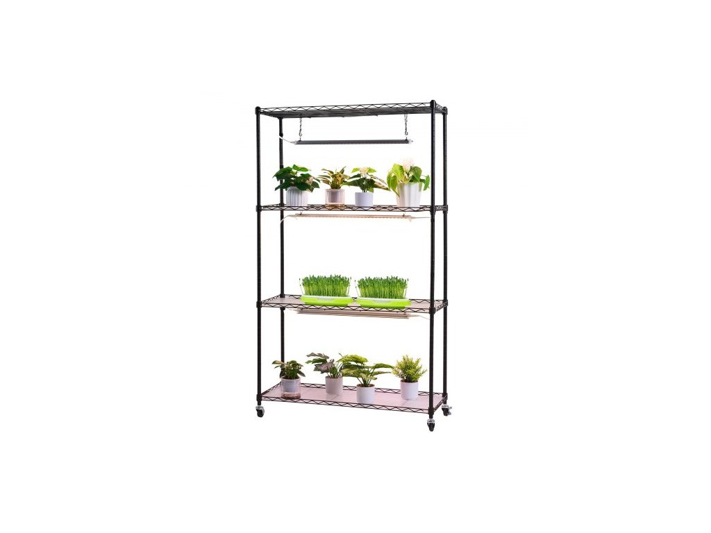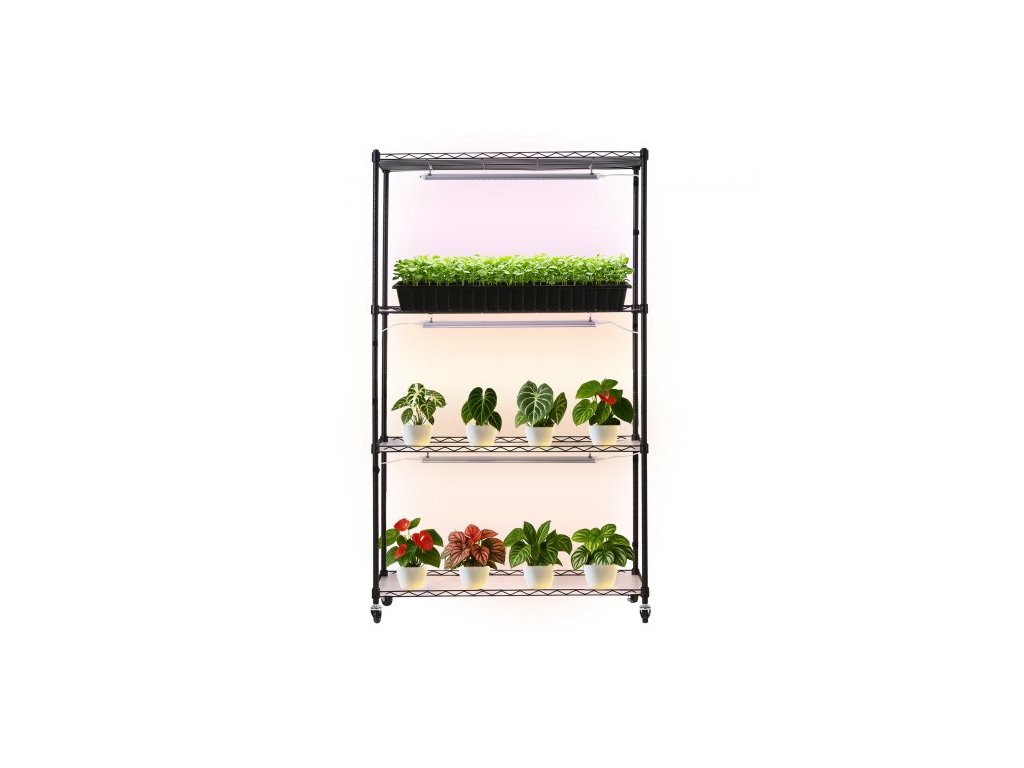 Celková výška: 59 palců/150 cm, Počet pěstebních světel: 3 x LED světelné lišty, Teplota barev: 3000K/3800K/3200K, Orientace regálu: Obrácená (ochranné lišty směřují nahoru), Celkový výkon: 90 W, Celková nosnost: 240 lbs/108,86 kg, Rozměry světla: 24,02 x 1,61 x 0,95 palce/610 x 41 x 24 mm, Rozměry produktu: 35,43 x 13,78 x 59,06 palce/900 x 350 x 1500 mm,Barvy světla: Teplá žlutá/Jemná bílo-růžová/Smíšená,Základna: Otočná gumová kolečka,Počet polic: 4 úrovně,Ovládání osvětlení: 3 režimy barev světla + nezávislé přepínače barev,Výkon jednoho světla: 30 W,Číslo modelu položky: 4C15090-2020T06P3-US,Rozměry police: 35,4 x 13,8 palce/90 x 35 cm,Čistá hmotnost: 19,4 lbs/8,8 kg