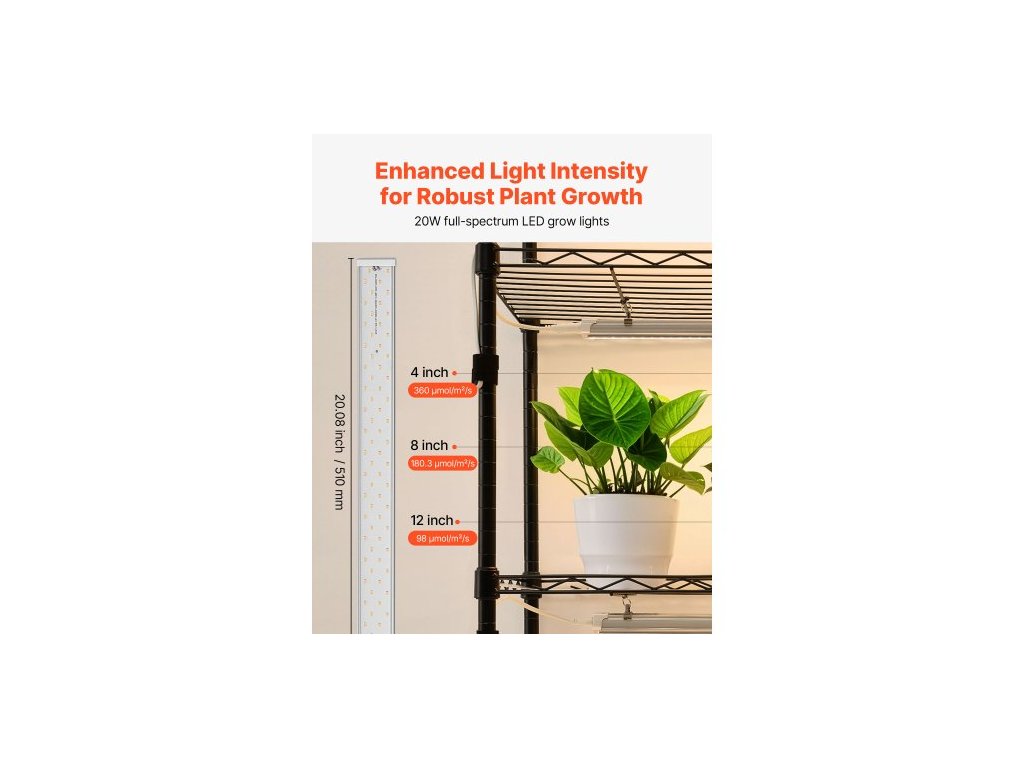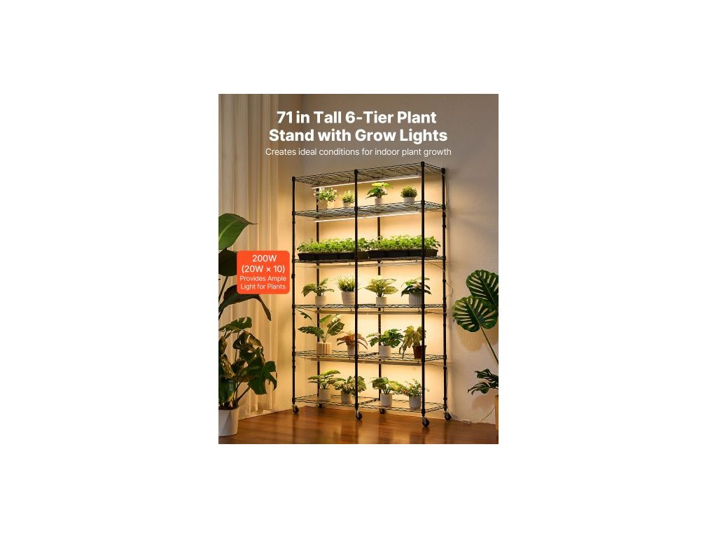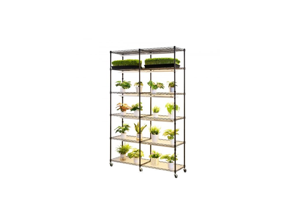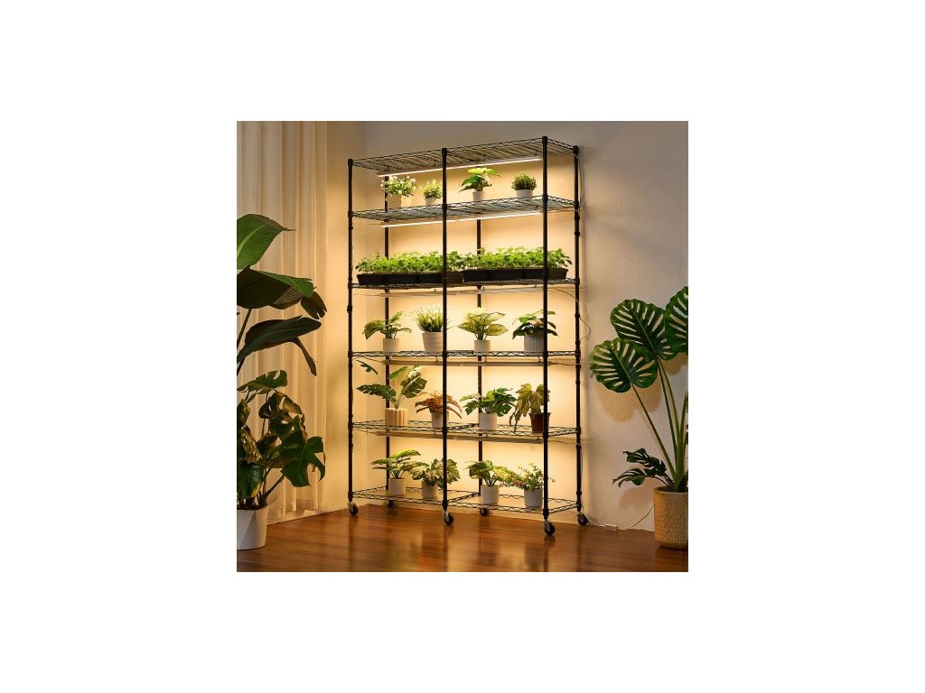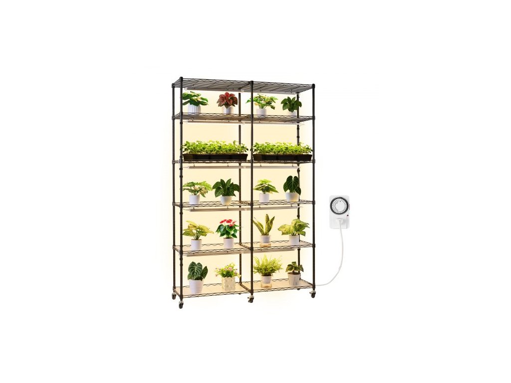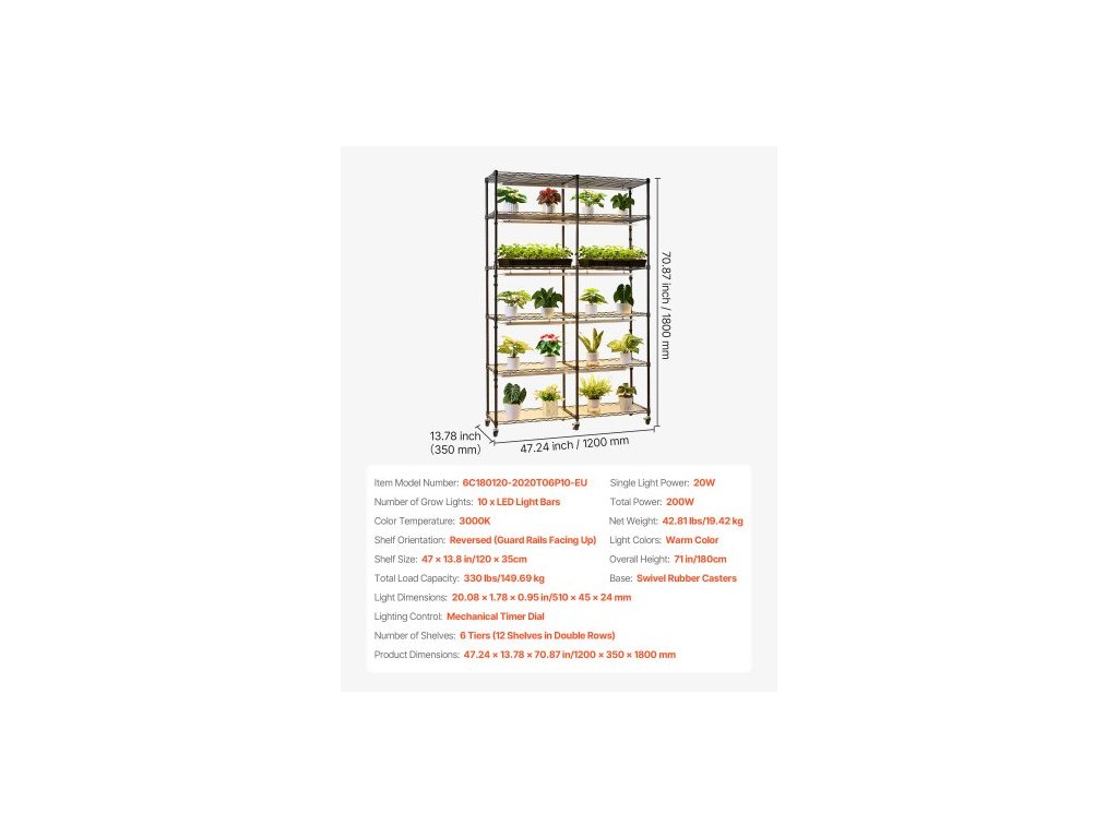 Celková výška: 180 cm, Počet pěstebních světel: 10 x LED světelných tyčí, Teplota barev: 3000K, Orientace police: Obrácená (ochranné lišty nahoru), Celkový výkon: 200 W, Celková nosnost: 149,69 kg, Rozměry světla: 510 x 45 x 24 mm, Rozměry výrobku: 47,24 x 13,78 x 70,87 palce/1200 x 350 x 1800 mm, Barvy světla: Teplé barvy, Podstavec: Otočná gumová kolečka, Počet polic: 6 úrovní (12 polic ve dvojitých řadách), Ovládání osvětlení: Mechanický časovač, Výkon jednoho světla: 20 W, Číslo modelu položky: 6C180120-2020T06P10-EU, Rozměry police: 47 x 13,8 palce/120 x 35 cm, Čistá hmotnost: 42,81 lbs/19,42 kg