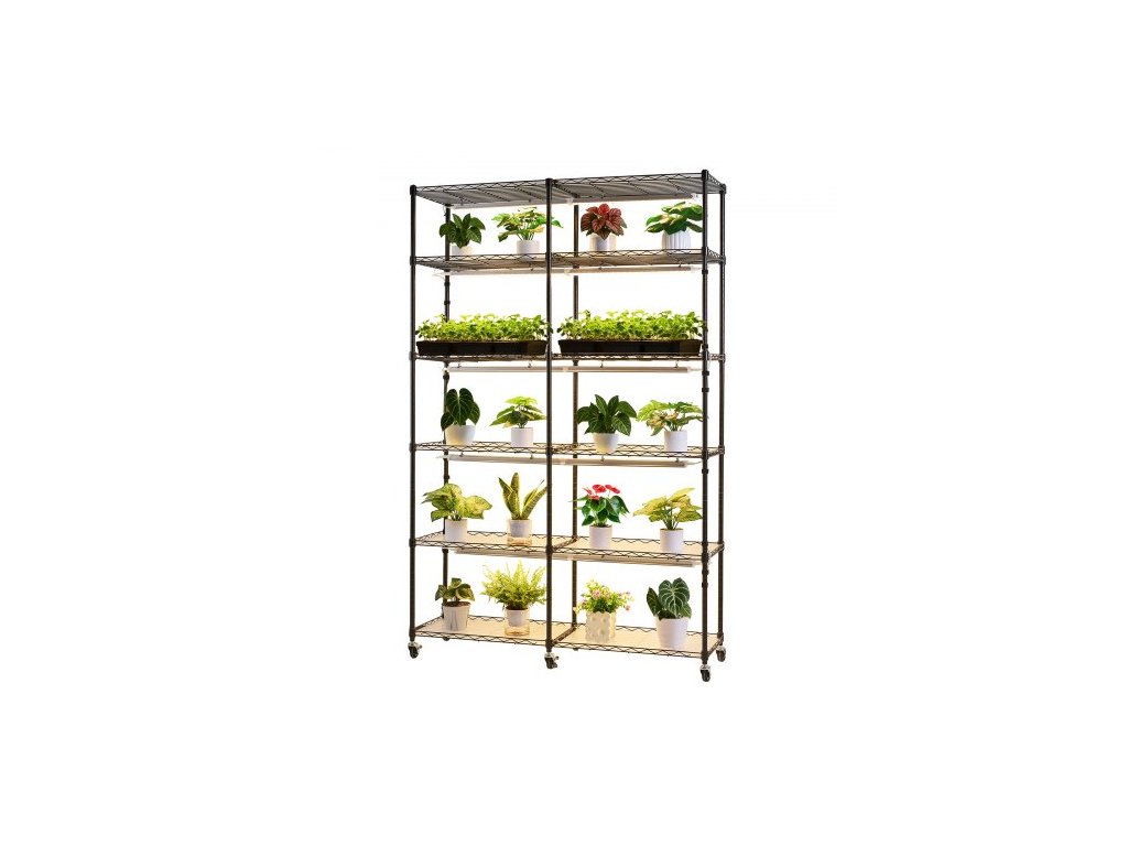 Rostlinný regál s pěstebním světlem, 6patrový dvouřadý stojan na rostliny, 180cm vysoký stojan na pokojové rostliny s kolečky a časovačem, 200W plnospektrální pěstební světla, kovový držák na květináče pro pěstování semen