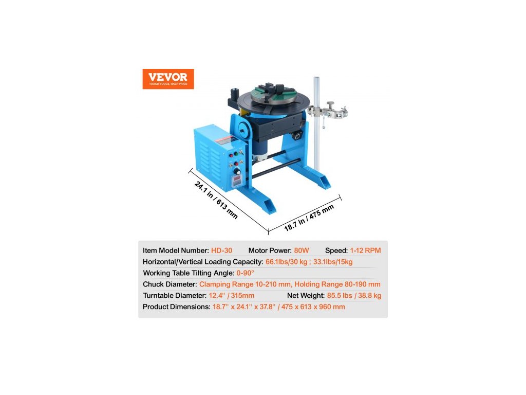 Otáčky: 1-12 ot./min,Úhel naklonění pracovního stolu: 0-90°,Průměr otočného stolu: 12,4'' / 315 mm,Číslo modelu: HD-30,Výkon motoru: 80 W,Průměr sklíčidla:Upínací rozsah 10-210 mm,Upínací rozsah 80-190 mm,Rozměry výrobku: 18,7'' x 24,1'' x 37,8'' / 475 x 613 x 960 mm, Čistá hmotnost: 85,5 lbs / 38,8 kg, Horizontální/vertikální nosnost: 66,1 lbs / 30 kg ; 33,1 lbs / 15 kg