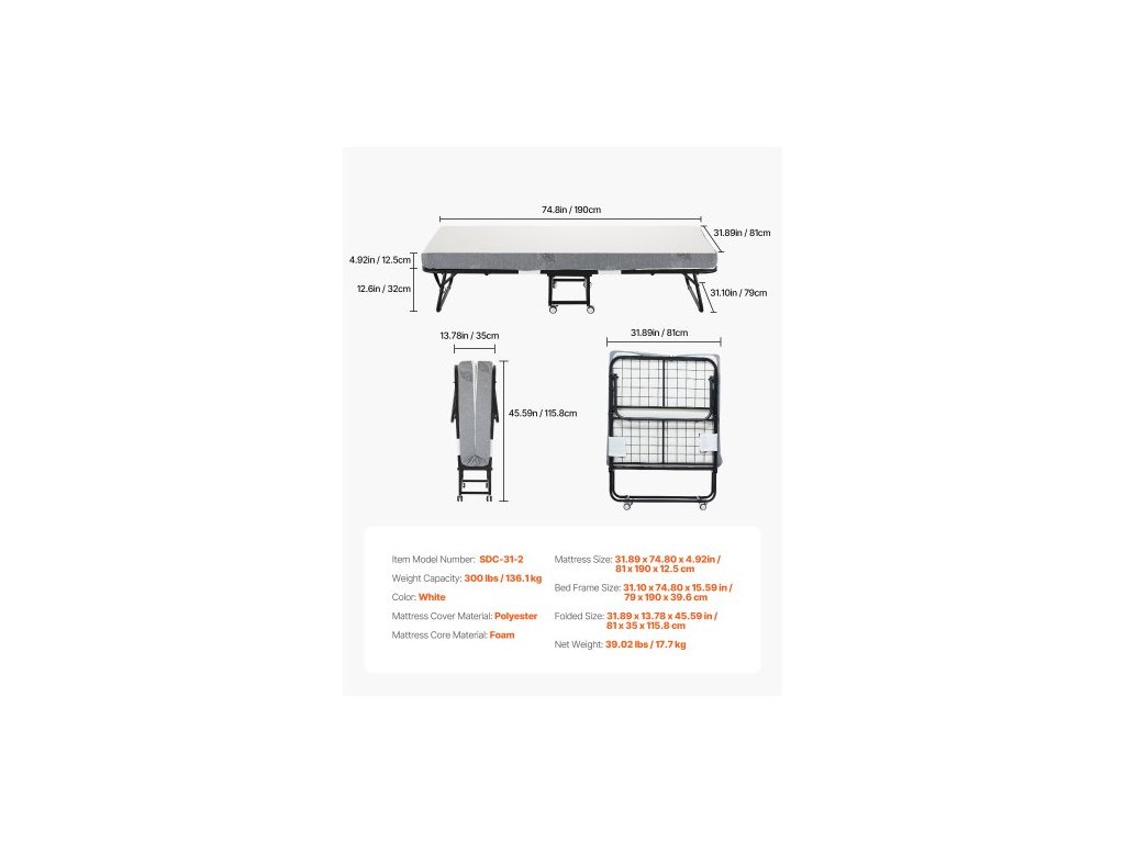 Nosnost: 300 lbs / 136,1 kg,Rozměry rámu postele: 31,10 x 74,80 x 15,59" / 790 x 1900 x 396 mm,Barva: Bílá,Číslo modelu položky: SDC-31-2,Rozměry ve složeném stavu: 31,89 x 13,78 x 45,59" / 810 x 350 x 1158 mm,Materiál potahu matrace: Polyester, Čistá hmotnost: 17,7 kg, Materiál jádra matrace: Pěna, Rozměry matrace: 810 x 1900 x 125 mm
