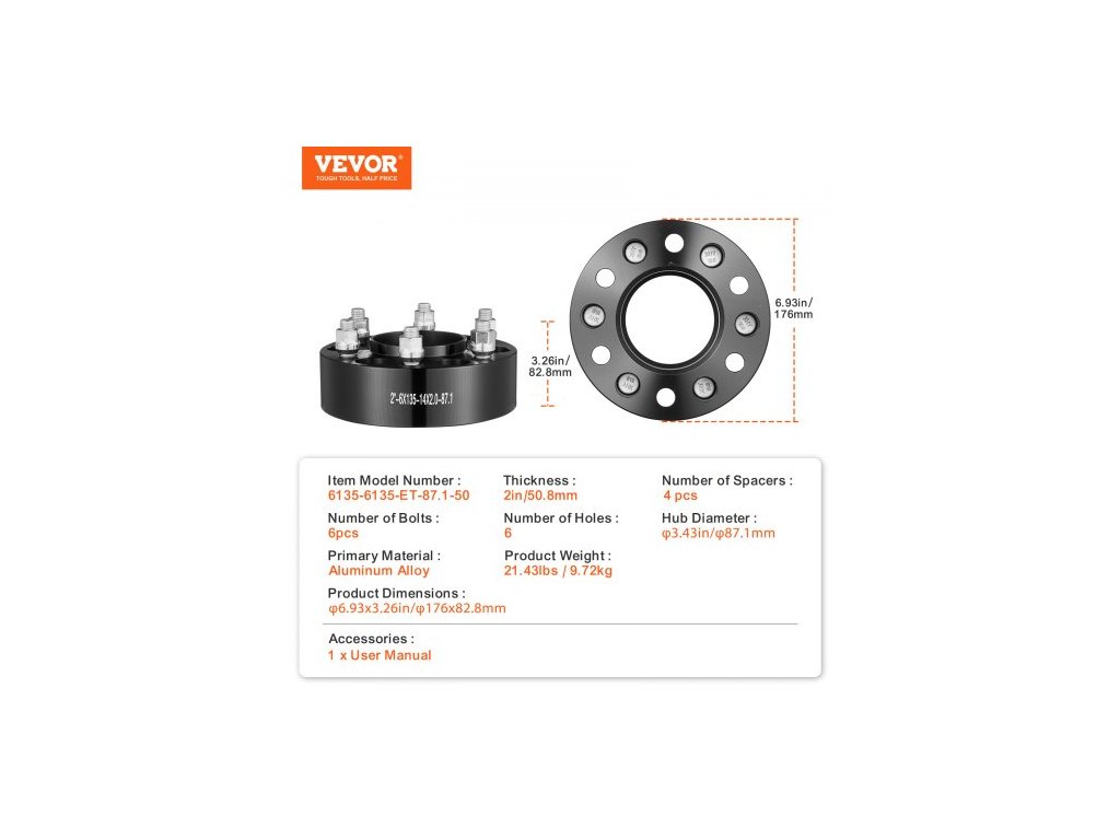 Tloušťka: 2 palce / 50,8 mm,Primární materiál: Hliníková slitina,Počet šroubů: 6 ks,Počet otvorů: 6,Průměr náboje: φ3,43 palce / φ87,1 mm,Číslo modelu položky: 6135-6135-ET-87.1-50,Hmotnost výrobku: 21,43 lbs / 9,72 kg,Počet rozpěrek: 4 ks, rozměry produktu: φ6,93x3,26 palce / φ176x82,8 mm