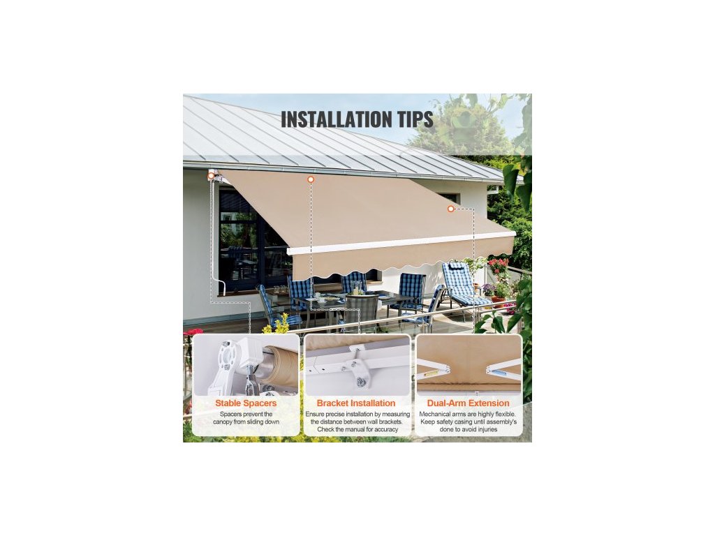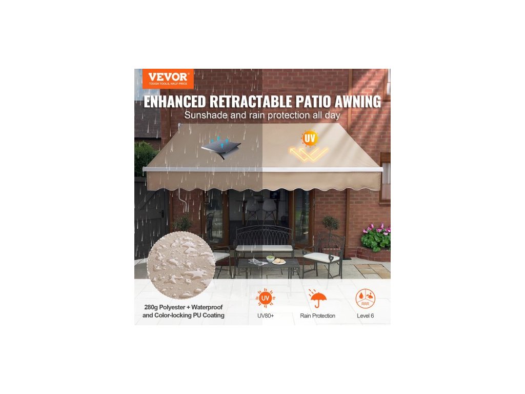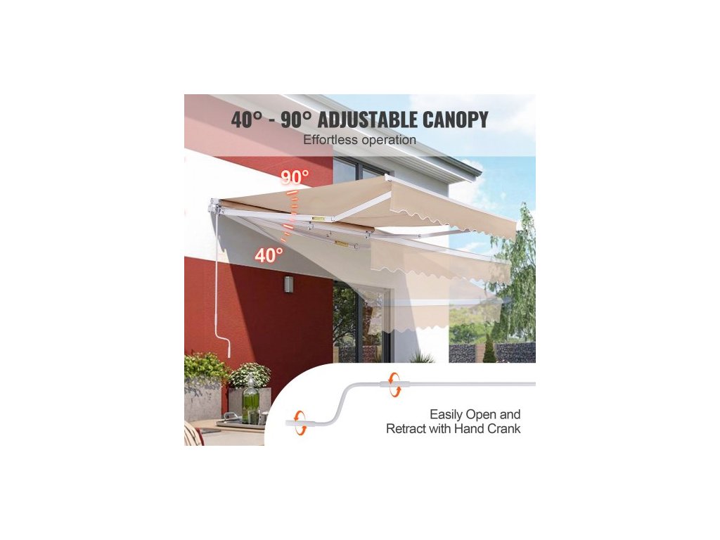Ručně zatahovací markýza, 12 x 10 stop venkovní markýza na terasu, zatahovací sluneční clona, voděodolný polyesterový slunečník na terasu, dveře, okna, markýza s klikou na zahradu, balkon