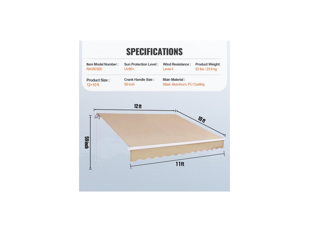 Velikost kliky: 59 palců,Číslo modelu položky: RA350300,Odolnost proti větru: Úroveň 4,Hmotnost výrobku: 52 lbs/23,6 kg,Hlavní materiál: Ocel + hliník + 280G oboustranný PU povlak,Úroveň ochrany proti slunci: UV80+,Rozměry výrobku: 12×10 stop