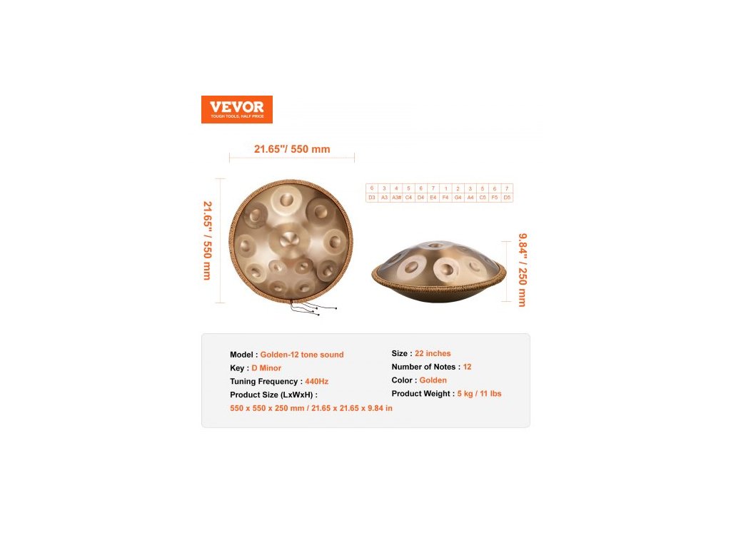 Rozměry výrobku (DxŠxV): 550 x 550 x 250 mm / 21,65 x 21,65 x 9,84 palce,Velikost: 22 palců,Barva: Zlatá,Číslo modelu výrobku: Zlatý - 12tónový zvuk,Počet not: 12,Hmotnost výrobku: 5 kg / 11 liber,Ladicí frekvence: 440 Hz,Tónina: d moll