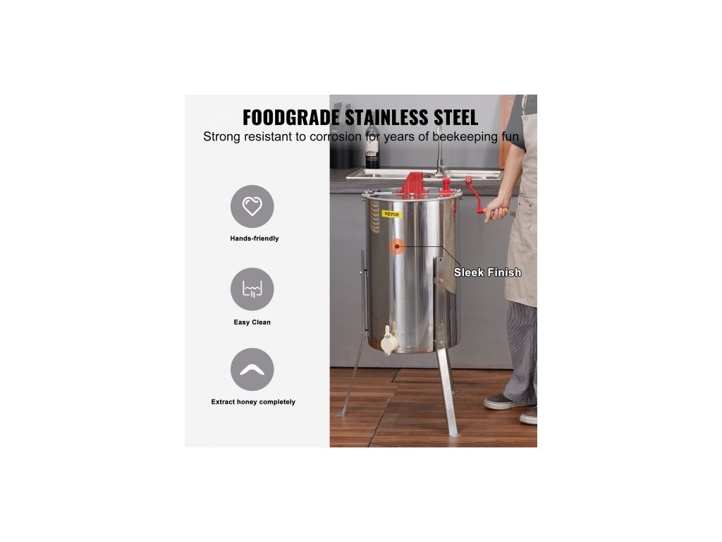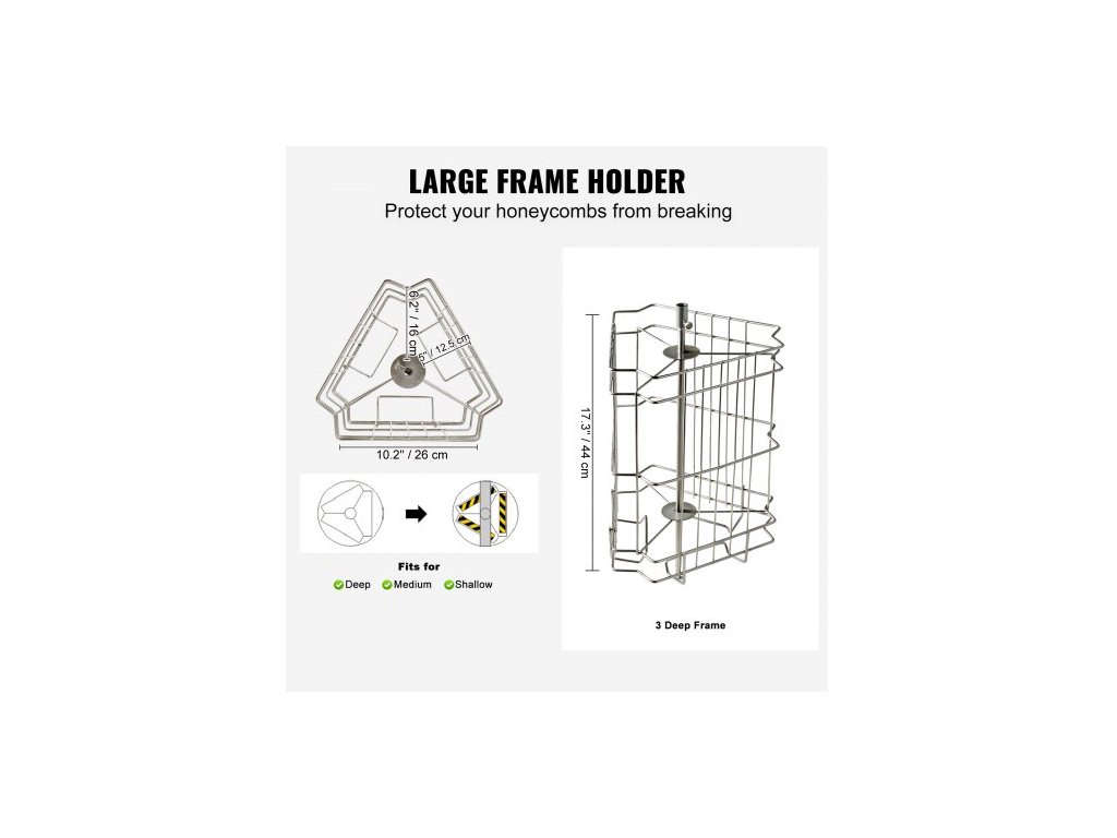 Rozměry upravené plástve: Hloubka: 48 x 23 cm, Střední: 48 x 16 cm,Kapacita: 3 rámky,Model: SD-3,Hmotnost výrobku: 9,8 kg,Medová brána: 45 mm,Materiál: Nerezová ocel,Ovládání: Ruční
