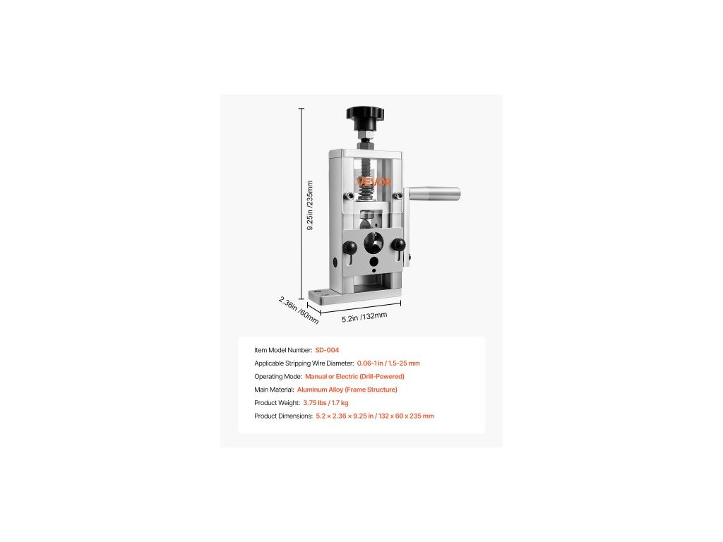 Použitelný průměr odizolovacího drátu: 0,06-1 palce / 1,5-25 mm,Číslo modelu položky: SD-004,Hmotnost výrobku: 3,75 lbs/1,7 kg,Provozní režim: Ruční nebo elektrický (s vrtačkou),Rozměry výrobku: 5,2 x 2,36 x 9,25 palce/132 x 60 x 235 mm,Hlavní materiál: Hliníková slitina (rámová konstrukce)
