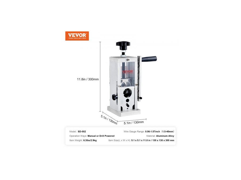 Ruční odizolovací stroj , odizolovací kleště na měděné vodiče 1,5 mm–40 mm s ruční klikou nebo vrtačkou, viditelná hloubka odizolování, přenosný hliníkový rám, odizolovací kleště na měděný odpad, texturovaný váleček, nastavitelné šrouby, nastavitelná rukojeť, 2 způsoby ovládání, kompletní příslušenství, široké využití, možnosti ovládání: ruční nebo vrtačkou, rozsah tloušťky vodiče: 1,5–40 mm, model: SD-002, materiál: hliníková slitina, rozměry (D x Š x V): 130 x 130 x 300 mm, hmotnost: 2,9 kgDoplňkové parametry