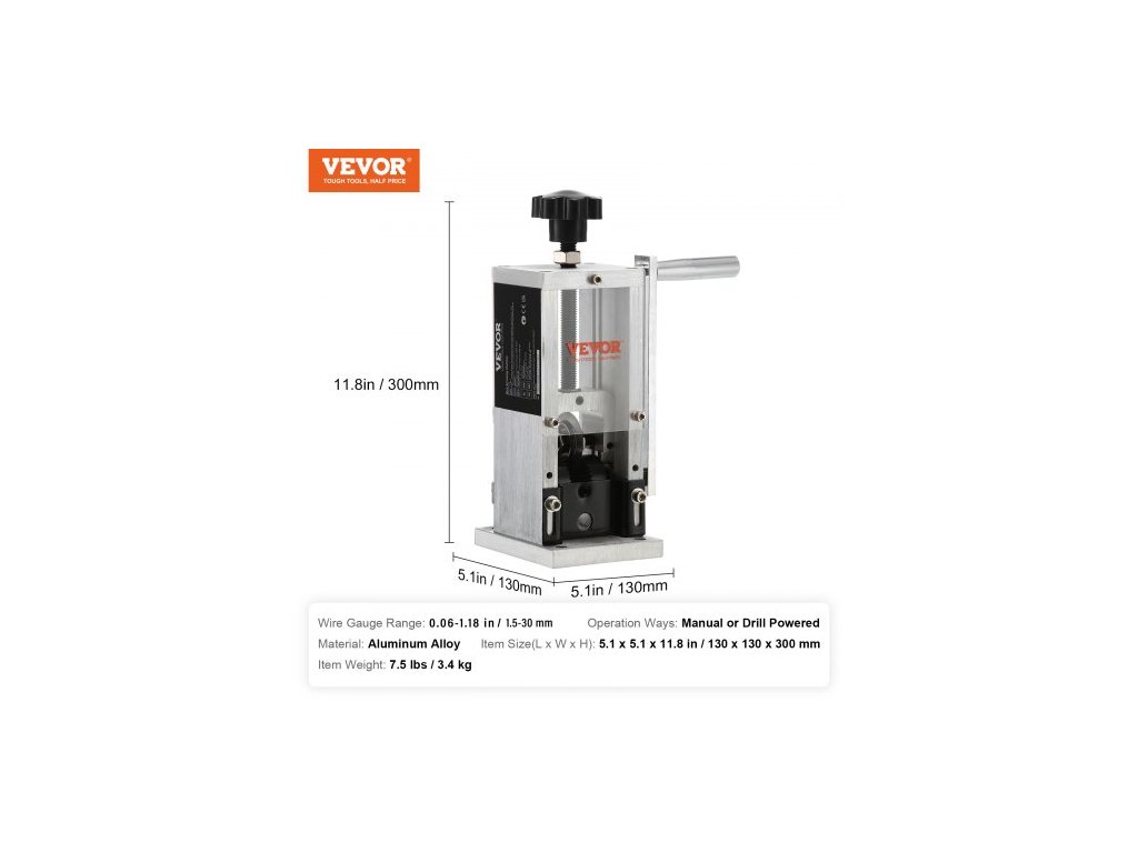 Způsoby ovládání: Ruční nebo vrtačkou,Rozsah tloušťky vodiče: 0,06–1,18 palce / 1,5–30 mm,Model: BXJSDK1,Materiál: Hliníková slitina,Rozměry položky (D x Š x V): 5,1 x 5,1 x 11,8 palce / 130 x 130 x 300 mm,Hmotnost položky: 7,5 lbs / 3,4 kg