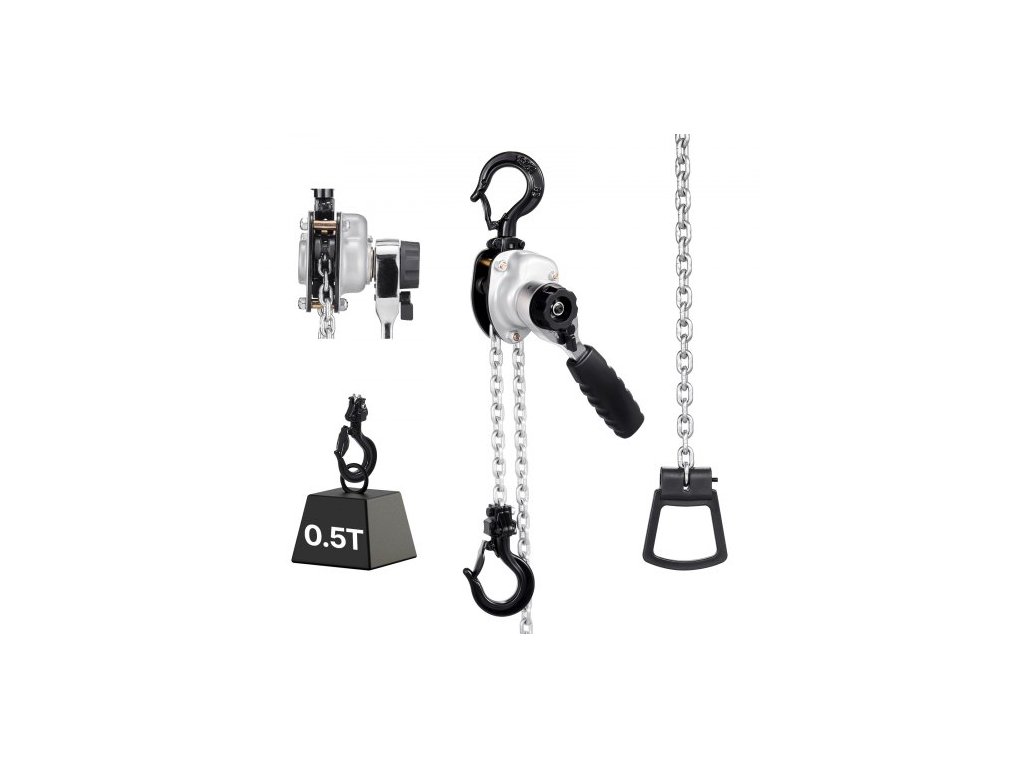 Ruční pákový řetězový kladkostroj , nosnost 1/2T 500KG, pro těžké práce, řetěz 3M Lift z legované oceli G80 s dvojitou mechanickou brzdou, háky otočné o 360°, pro sklady, stavebnictví a garážeDvojitá mechanická brzda
