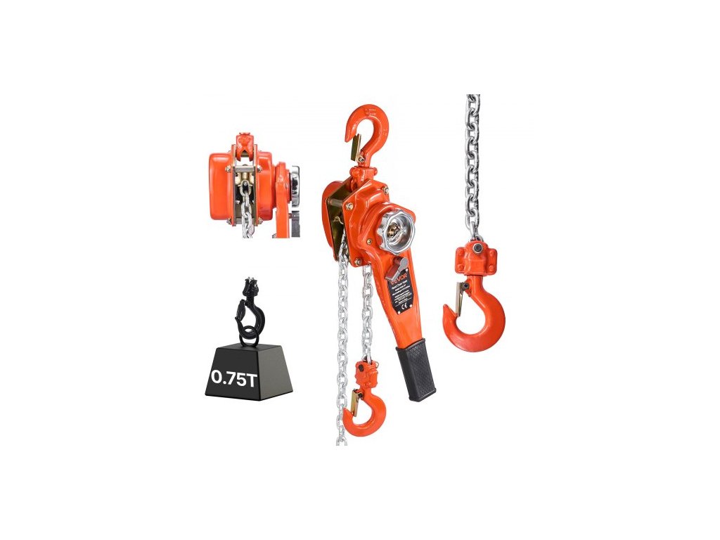 Ruční pákový řetězový kladkostroj , nosnost 3/4T 750KG, těžký provoz, zdvih 1,5M, řetěz z legované oceli G80 s dvojitou západkovou mechanickou brzdou, háky otočné o 360°, pro sklady, stavební garážeDvojitá západková mechanická brzda