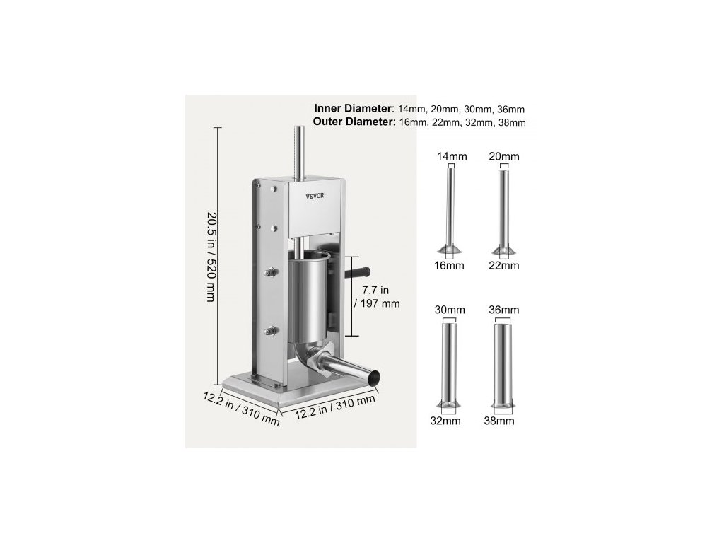 Těsnicí kroužek: Silikon (potravinářský), Typ: Vertikální, Přítlačná deska: Hliník (potravinářský), Kapacita: 3 l, Vnitřní průměr trubice: 14 mm, 20 mm, 30 mm, 36 mm, Vnější průměr trubice: 16 mm, 22 mm, 32 mm, 38 mm, Celkové rozměry stroje: 310 x 310 x 20,5 palce 310 x 520 mm,Model: XZ-3,Ovládání: Ruční,Hmotnost netto: 9,9 kg,Materiál válce a trubek: SUS304 (potravinářská kvalita)