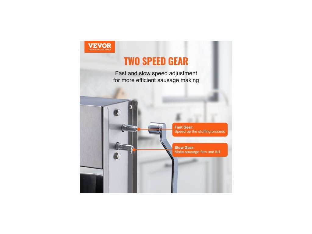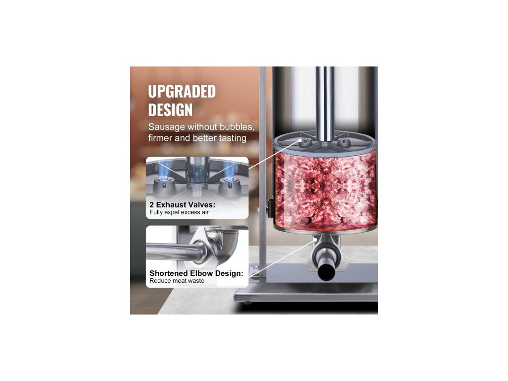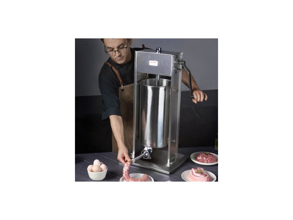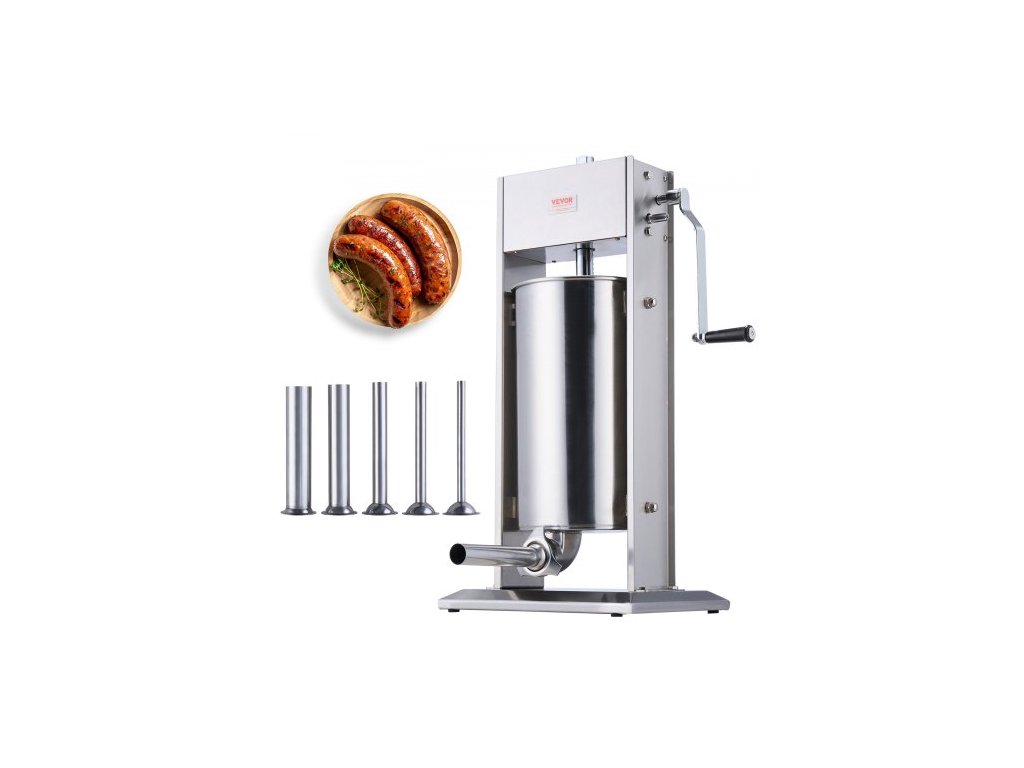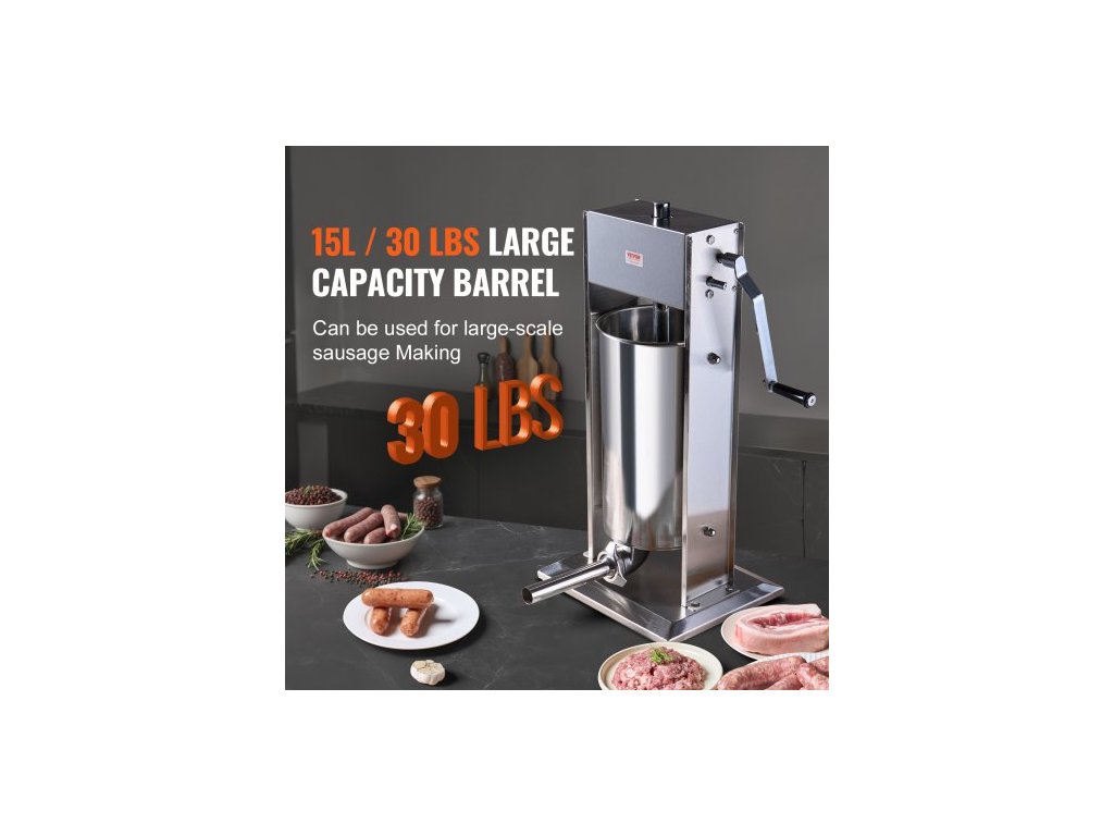 Ruční plnička klobás , vertikální stroj na klobásy o objemu 15 l / 30 liber, dvourychlostní plnička masa, vyrobeno z potravinářské nerezové oceli 304, obsahuje 5 plnicích trubic, pro domácí kuchyni, restauraci, komerční použitíRuční plnička klobás pro komerční použití