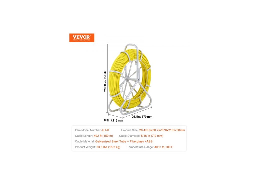 Číslo modelu položky: JLT-6,Hmotnost výrobku: 33,5 lbs/15,2 kg,Průměr kabelu: 5/16 palce (7,9 mm),Materiál kabelu: Pozinkovaná ocelová trubka + skelné vlákno + ABS,Teplotní rozsah: -40℃ až +80℃,Délka kabelu: 492 stop/150 m,Rozměry výrobku: 26,4 x 8,5 x 30,7 palce/670 x 215 x 780 mm