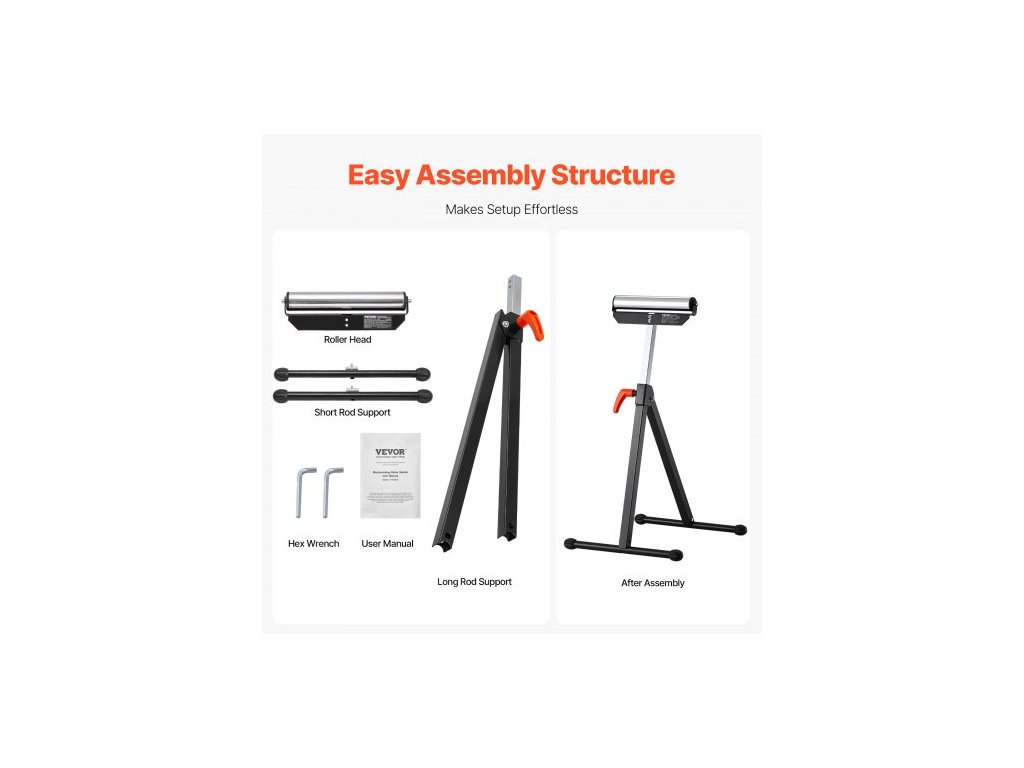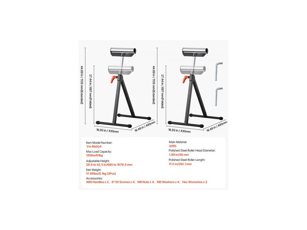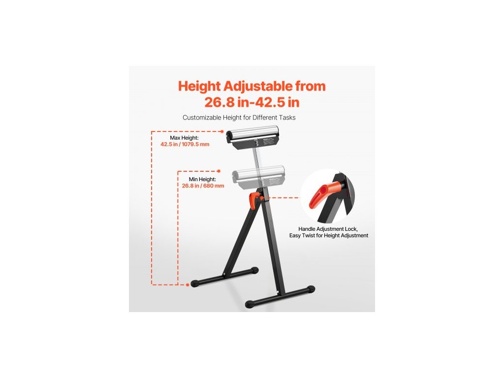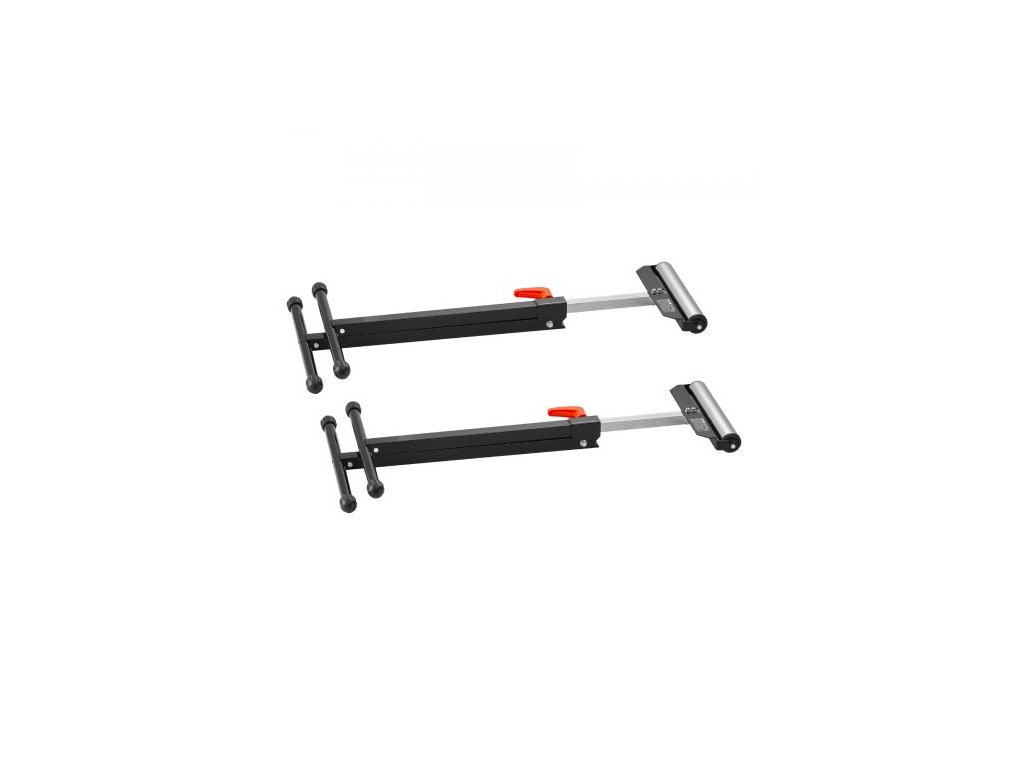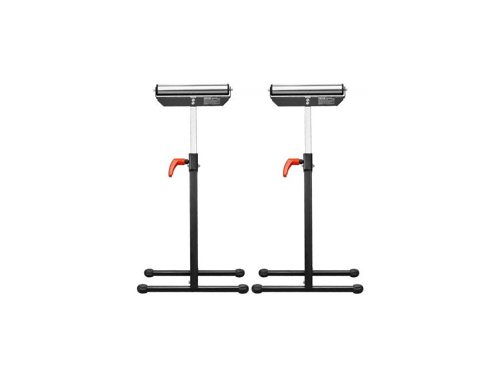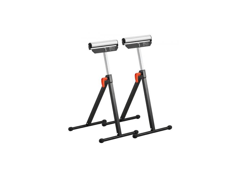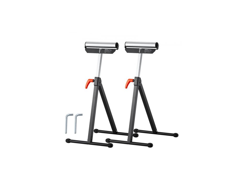 Sada 2 válečkových stojanů , nosnost 66 kg, nastavitelná výška 72,5–107,5 cm, skládací odolná konstrukce s leštěnou ocelovou válečkovou hlavou o průměru 29,5 cm, pro prodloužení podpěry pro stolní pilu, obrábění dřeva