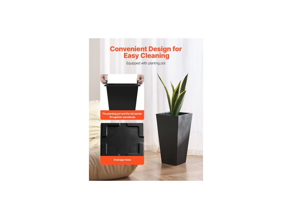 Sada 2 vysokých venkovních květináčů 22 palců, velké květináče pro venkovní i pokojové rostliny, černé zúžené čtvercové květináče na verandu, květináče s moderním designem a vestavěnou drenážíZtluštěný PP materiál