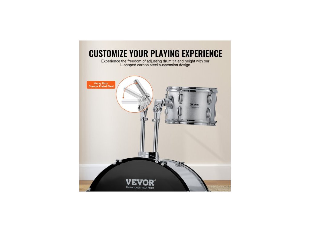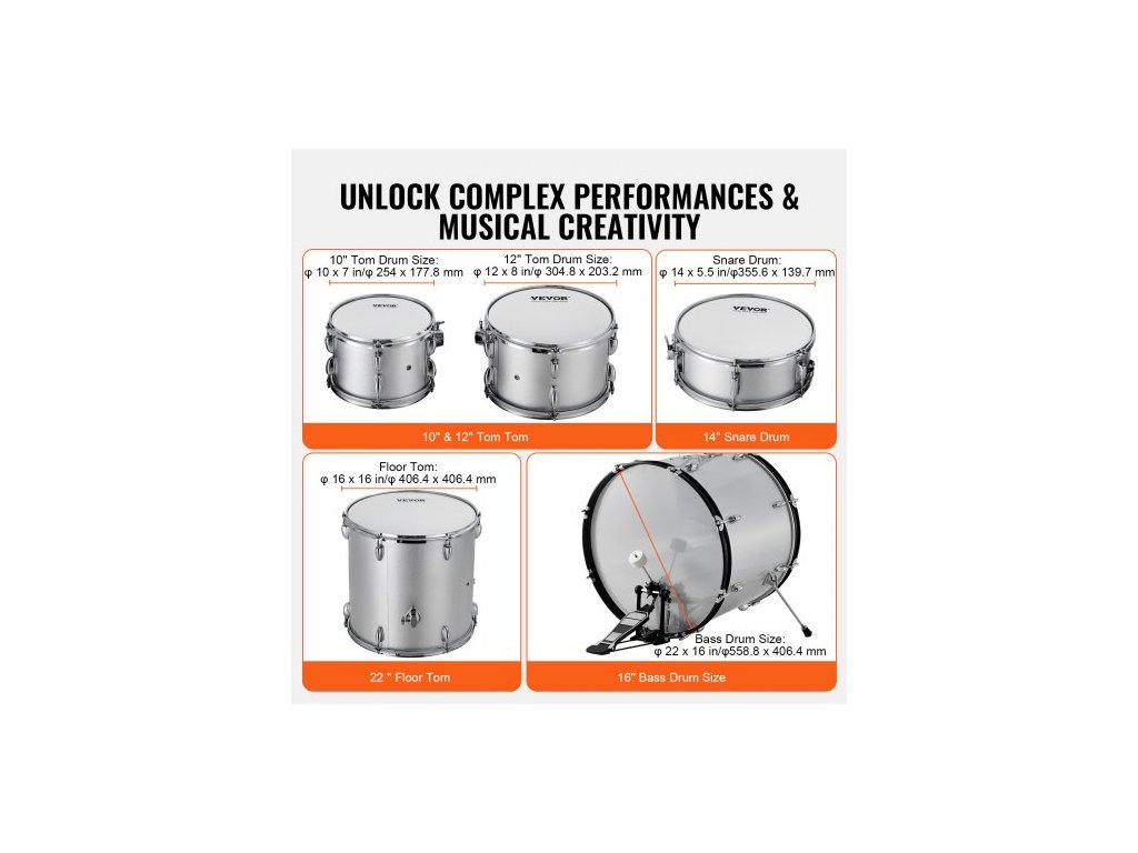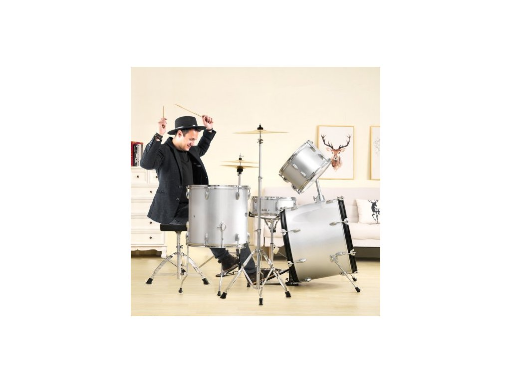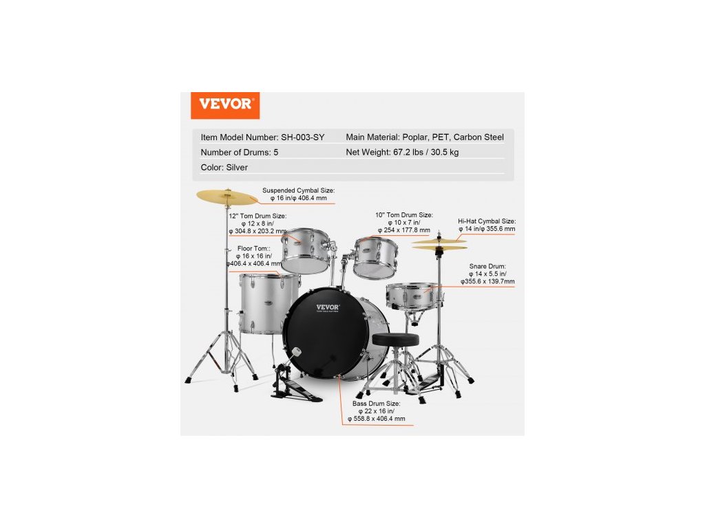 Počet bubnů: 5, Barva: Stříbrná, Číslo modelu: SH-003-SY, Čistá hmotnost: 67,2 lbs / 30,5 kg, Hlavní materiál: Topol, PET, uhlíková ocel