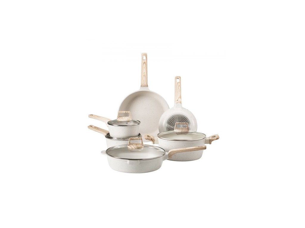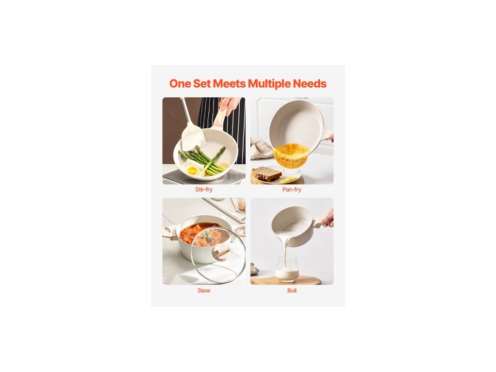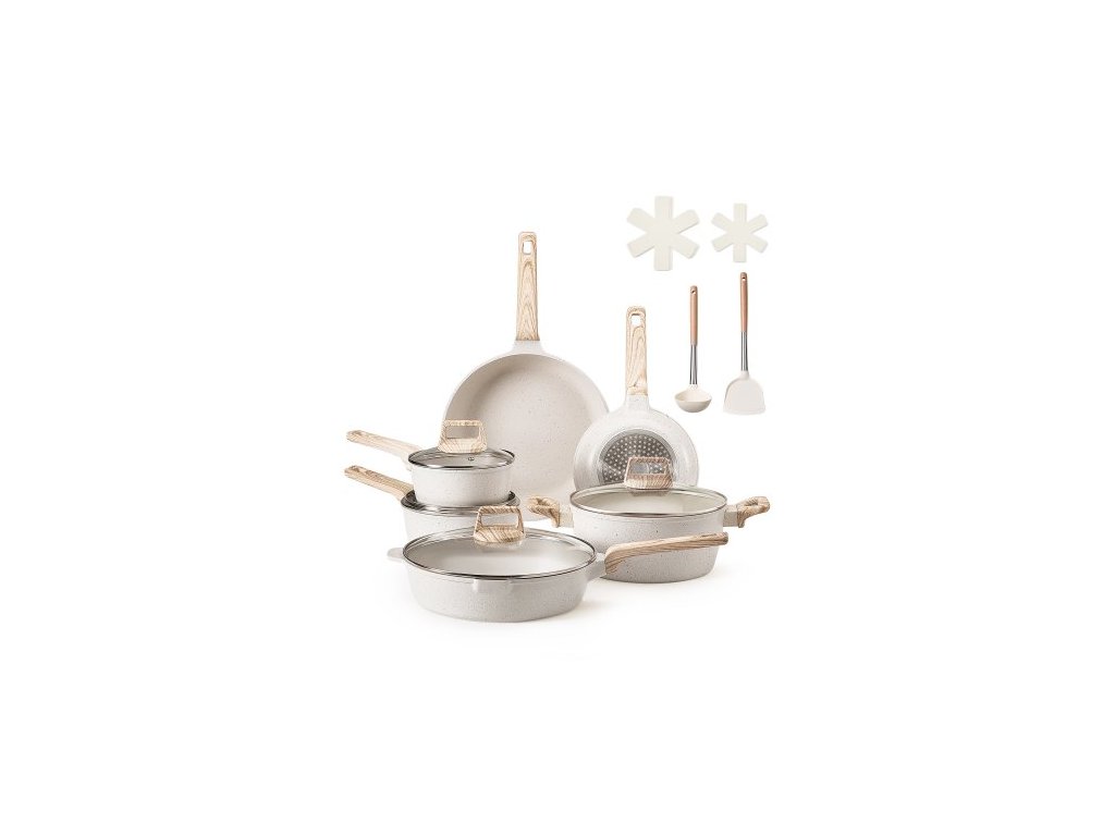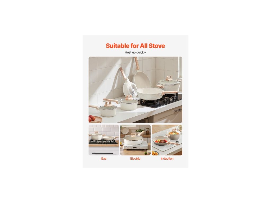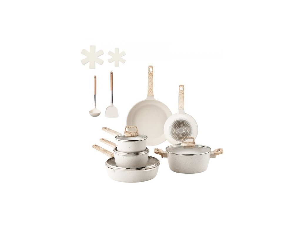 Sada hrnců a pánví 17dílná, sada nádobí s nepřilnavým povrchem z žuly, indukční nádobí, kuchyňské sady pro karavany s poklicemi na smažení, omáčku, restování, tvrzené sklo a chrániče pánví, bíláVíce kusů v sadě