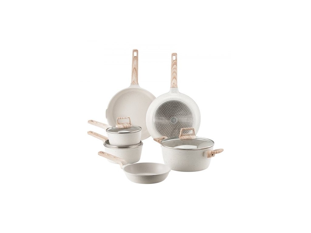 Sada hrnců a pánví 17dílná, sada nádobí s nepřilnavým povrchem z žuly, indukční nádobí, kuchyňské sady pro karavany s pokličkou na smažení, omáčku, restování, poklice z tvrzeného skla a chrániče pánví, bílá