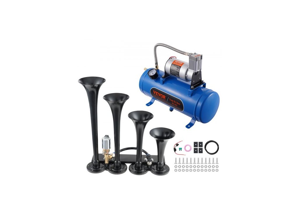 Objem nádrže: 1,6 gal/6 l, Maximální hladina hluku: 150 dB, Provozní tlak: ZAP 90 psi - VYP 120 psi, Napětí: 12V, Číslo modelu položky: HS-660, Rozměry klaksonu: 12,8 x 13,6 x 4,7 palce/325 x 345 x 120 mm, Velikost kompresoru: 16,3 x 6,0 x 11,2 palce/415 x 153 x 285 mm, Počet trychtýřů: 4, Čistá hmotnost: 13,4 lbs/6,1 kg (včetně veškerého příslušenství), Výkon: 190 W