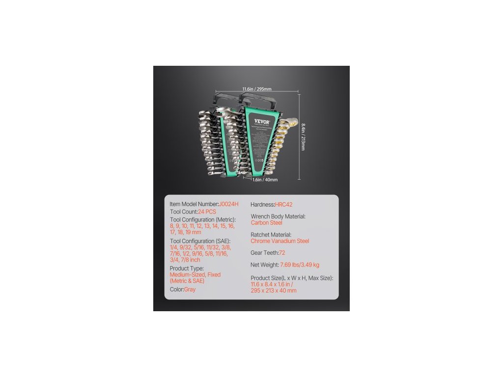 Materiál ráčny: chrom-vanadová ocel,Rozměry výrobku (D x Š x V, maximální velikost): 11,6 x 8,4 x 1,6 palce / 295 x 213 x 40 mm,Typ výrobku: Střední, pevný (metrické a SAE),Barva: Šedá,Počet zubů: 72,Číslo modelu položky: J0024H,Materiál těla klíče: uhlíková ocel,Konfigurace nástroje (metrické): 8-19 mm, Tvrdost: HRC42, Konfigurace nástroje (SAE): 1/4" až 7/8", Čistá hmotnost: 7,69 lbs/3,49 kg, Počet nástrojů: 24 ks